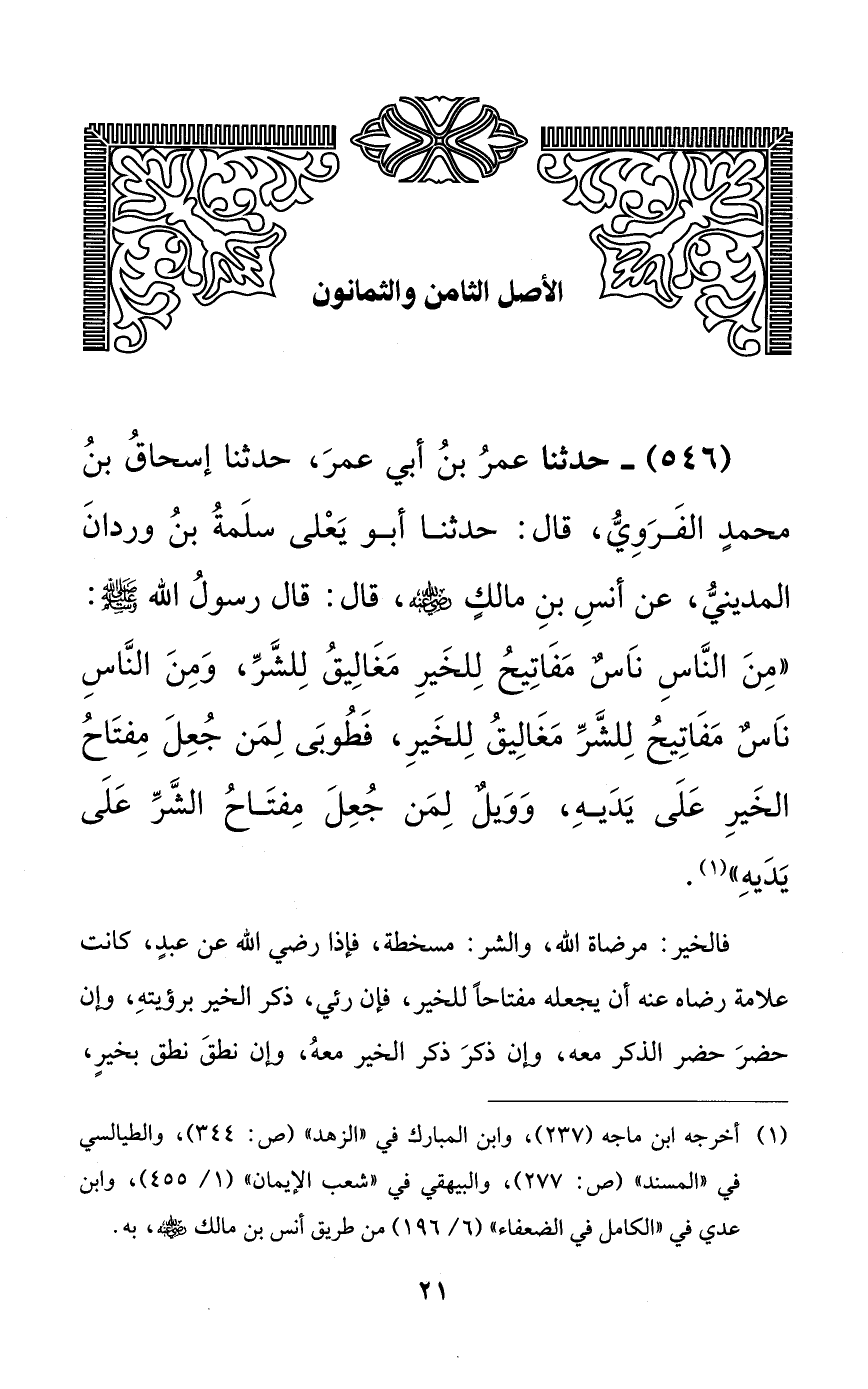 546 - حدثنا عمر بن أبي عمر، حدثنا إسحاق بن محمدٍ الفروي، قال: حدثنا أبو يعلى سلمة بن وردان المديني، عن أنس بن مالكٍ رضي الله عنه، قال: قال رسول الله صلى الله عليه وسلم: ((من الناس ناسٌ مفاتيح للخير مغاليق للشر، ومن الناس ناسٌ مفاتيح للشر مغاليق للخير، فطوبى لمن جعل مفتاح الخير على يديه، وويلٌ لمن جعل مفتاح الشر على يديه)).