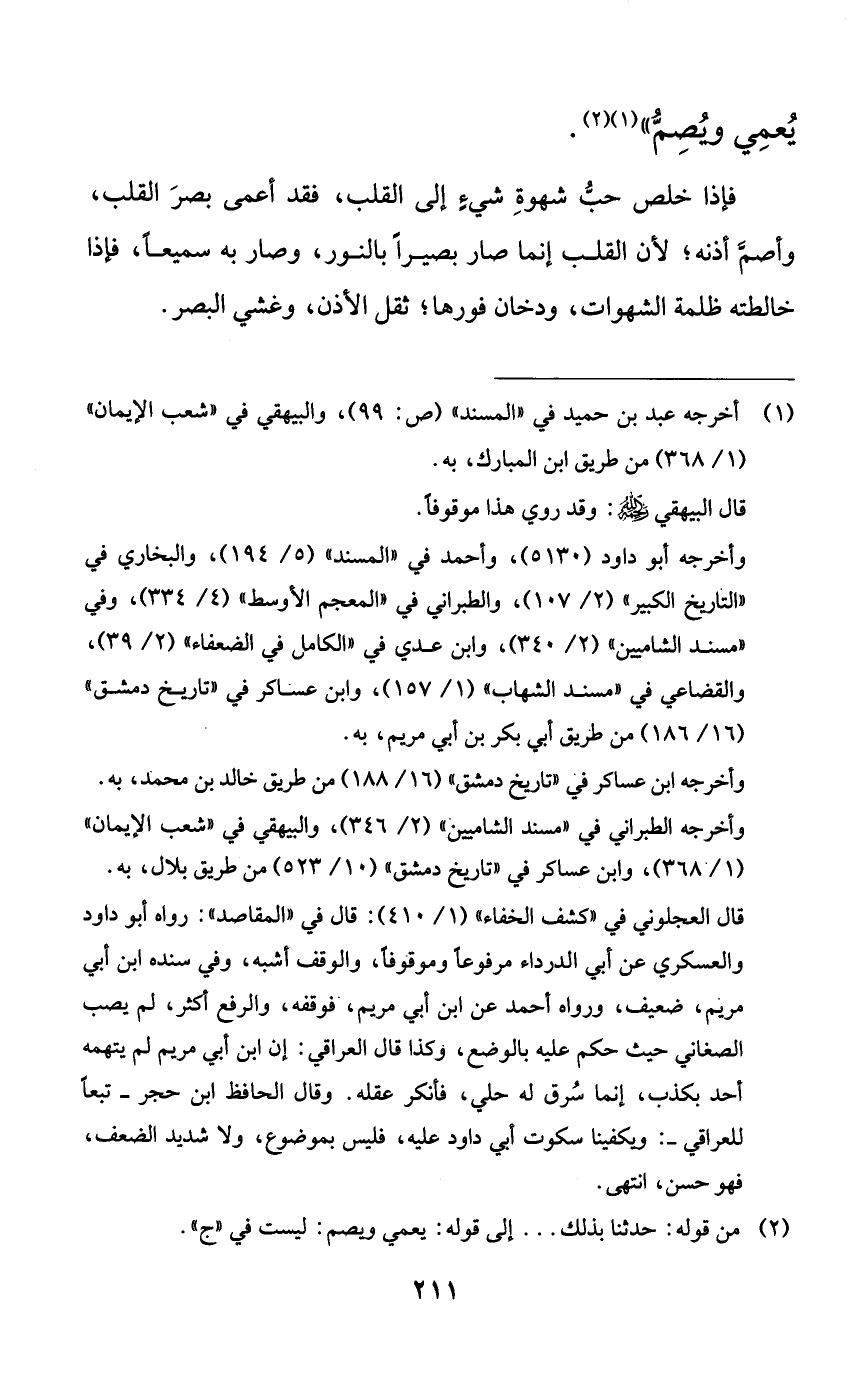 فإذا خلص حب شهوة شيءٍ إلى القلب، فقد أعمى بصر القلب، وأصم أذنه؛ لأن القلب إنما صار بصيراً بالنور، وصار به سميعاً، فإذا خالطته ظلمة الشهوات، ودخان فورها؛ ثقل الأذن، وغشي البصر.