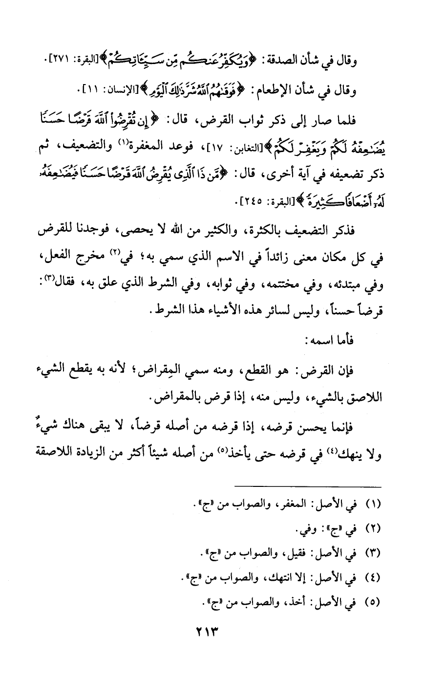 فذكر التضعيف بالكثرة، والكثير من الله لا يحصى، فوجدنا للقرض في كل مكان معنى زائداً في الاسم الذي سمي به؛ في مخرج الفعل، وفي مبتدئه، وفي مختتمه، وفي ثوابه، وفي الشرط الذي علق به، فقال: قرضاً حسناً، وليس لسائر هذه الأشياء هذا الشرط.