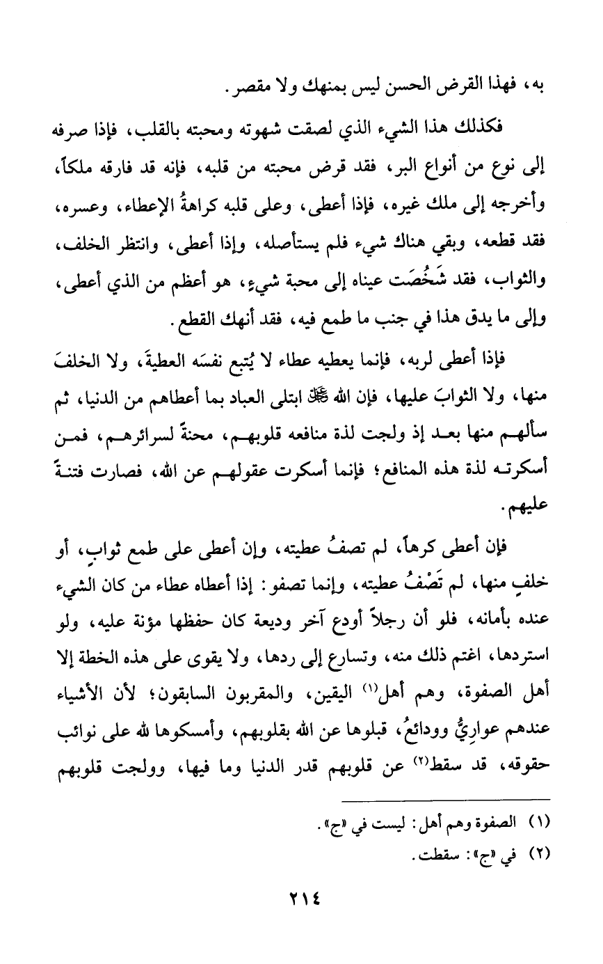 فكذلك هذا الشيء الذي لصقت شهوته ومحبته بالقلب، فإذا صرفه إلى نوع من أنواع البر، فقد فرض محبته من قلبه، فإنه قد فارقه ملكاً، وأخرجه إلى ملك غيره، فإذا أعطى، وعلى قلبه كراهة الإعطاء، وعسره، فقد قطعه، وبقي هناك شيء فلم يستأصله، وإذا أعطى، وانتظر الخلف، والثواب، فقد شخصت عيناه إلى محبة شيءٍ، هو أعظم من الذي أعطى، وإلى ما يدق هذا في جنب ما طمع فيه، فقد أنهك القطع.