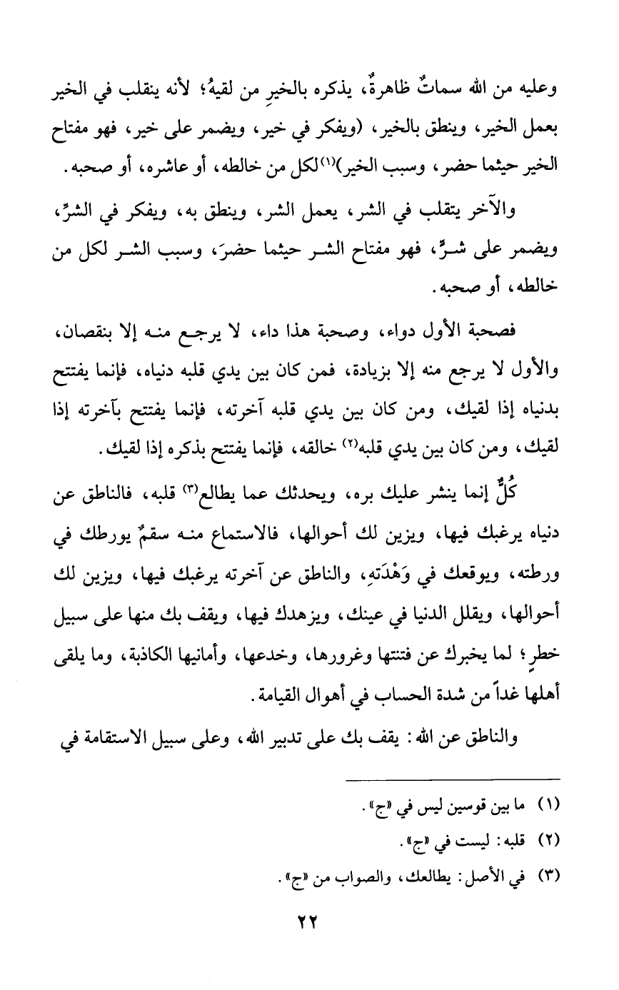 فصحبة الأول دواء، وصحبة هذا داء، لا يرجع منه إلا بنقصان، والأول لا يرجع منه إلا بزيادة، فمن كان بين يدي قلبه دنياه، فإنما يفتتح بدنياه إذا لقيك: ومن كان بين يدي قلبه آخرته، فإنما يفتتح بآخرته إذا لقيك، ومن كان بين يدي قلبه خالقه، فإنما يفتتح بذكره إذا لقيك.