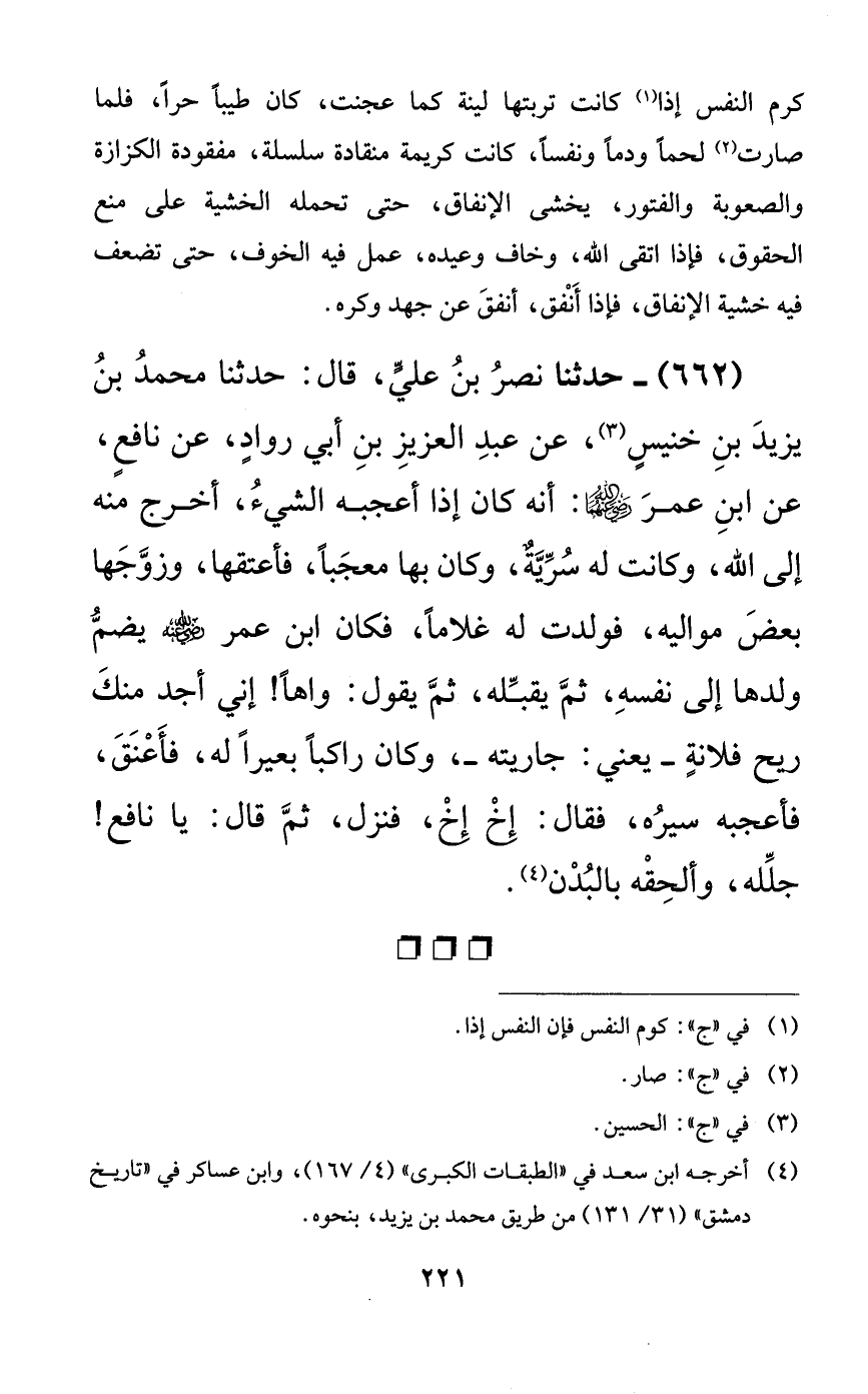 662 - حدثنا نصر بن عليٍّ، قال: حدثنا محمد بن يزيد بن خنيسٍ، عن عبد العزيز بن أبي روادٍ، عن نافعٍ، عن ابن عمر رضي الله عنهما: أنه كان إذا أعجبه الشيء، أخرج منه إلى الله، وكانت له سريةٌ، وكان بها معجباً، فأعتقها، وزوجها بعض مواليه، فولدت له غلاماً، فكان ابن عمر رضي الله عنه يضم ولدها إلى نفسه، ثم يقبله، ثم يقول: واهاً! إني أجد منك ريح فلانةٍ -يعني: جاريته-، وكان راكباً بعيراً له، فأعنق، فأعجبه سيره، فقال: إخ إخ، فنزل، ثم قال: يا نافع! جلله، وألحقه بالبدن.
