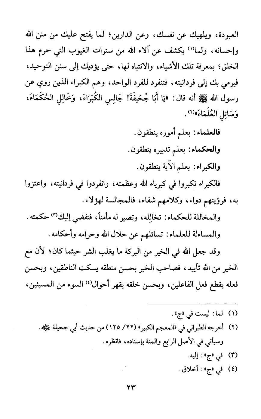 العبودة، ويلهيك عن نفسك، وعن الدارين؛ لما يفتح عليك من منن الله وإحسانه، ولما يكشف عن آلاء الله من سترات الغيوب التي حرم هذا الخلق؛ بمعرفة تلك الأشياء، والانتباه لها، حتى يؤديك إلى سنن التوحيد، فيرمي بك إلى فردانيته، فتنفرد للفرد الواحد، وهم الكبراء الذين روي عن رسول الله صلى الله عليه وسلم إنه قال: ((يا أبا جحيفة! جالس الكبراء، وخالل الحكماء، وسائل العلماء)).