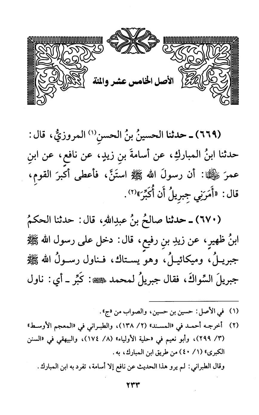 669 - حدثنا الحسين بن الحسن المروزي، قال: حدثنا ابن المبارك، عن أسامة بن زيدٍ، عن نافعٍ، عن ابن عمر رضي الله عنهما: أن رسول الله صلى الله عليه وسلم استن، فأعطى أكبر القوم، قال: ((أمرني جبريل أن أكبر)).