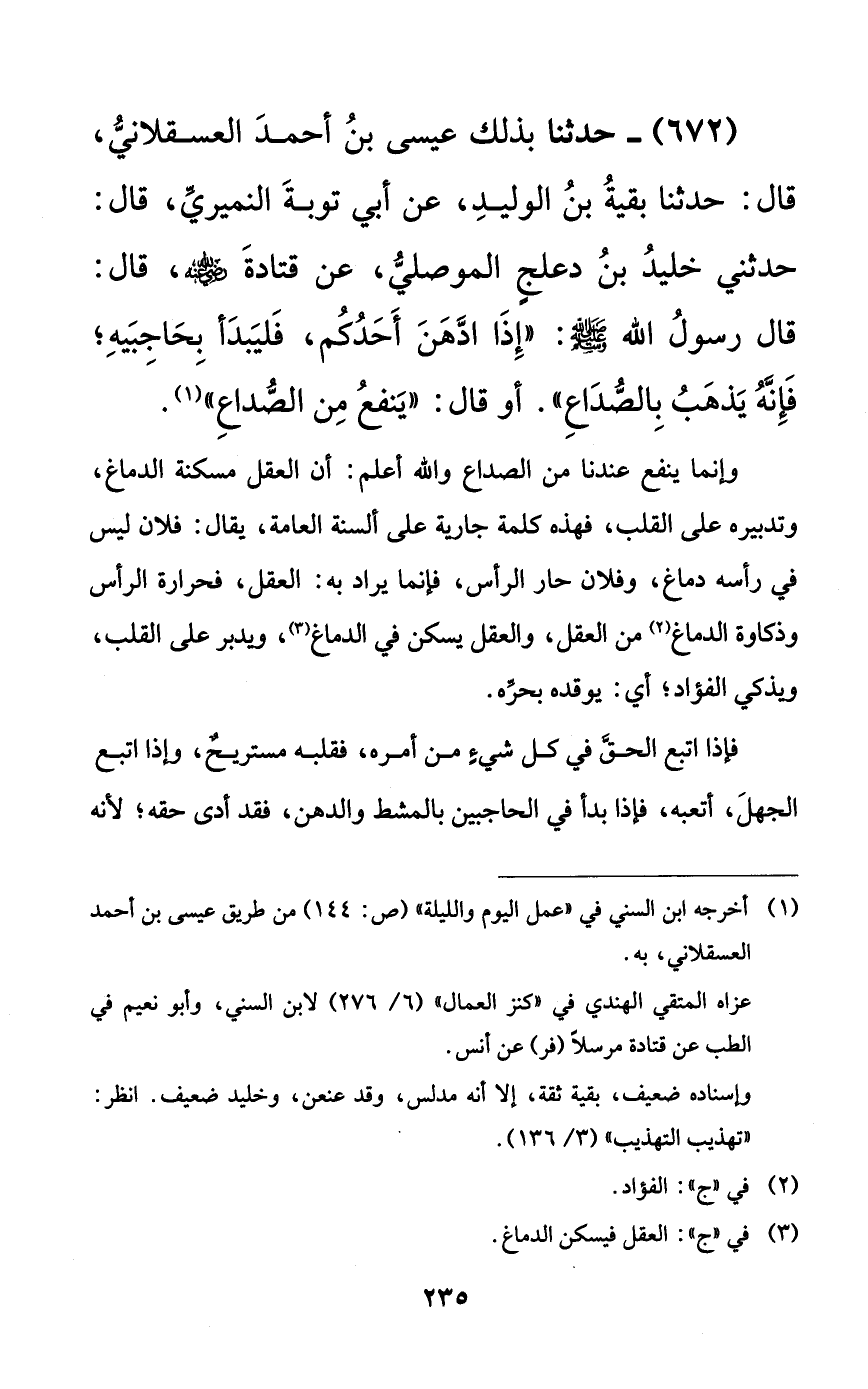 672 - حدثنا بذلك عيسى بن أحمد العسقلاني، قال: حدثنا بقية بن الوليد، عن أبي توبة النميري، قال: حدثني خليد بن دعلجٍ الموصلي، عن قتادة رضي الله عنه، قال: قال رسول الله صلى الله عليه وسلم: ((إذا ادهن أحدكم، فليبدأ بحاجبيه؛ فإنه يذهب بالصداع))، أو قال: ((ينفع من الصداع)).