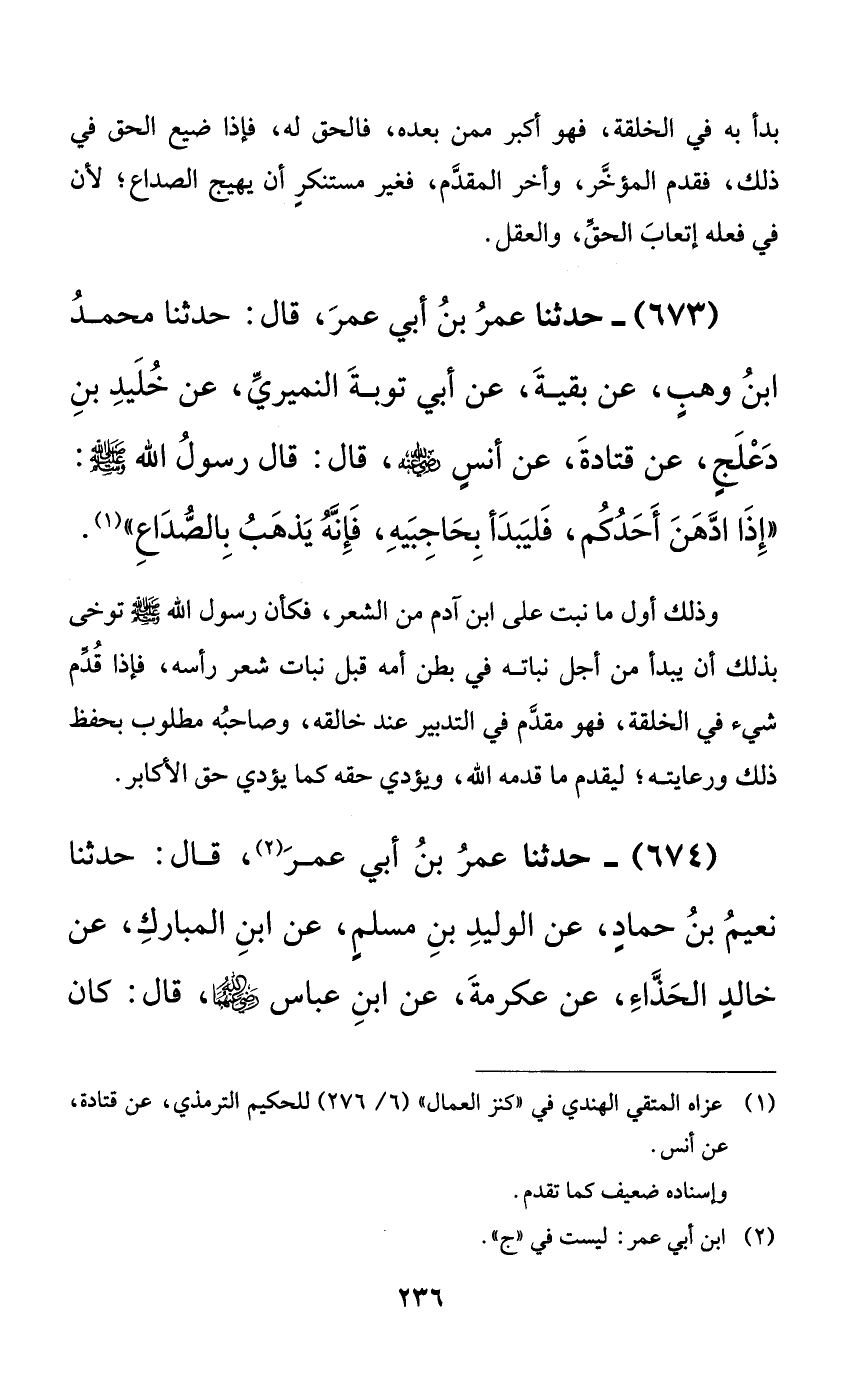 673 - حدثنا عمر بن أبي عمر، قال: حدثنا محمد ابن وهبٍ، عن بقية، عن أبي توبة النميري، عن خليد بن دعلجٍ، عن قتادة، عن أنسٍ رضي الله عنه، قال: قال رسول الله صلى الله عليه وسلم: ((إذا أدهن أحدكم، فليبدأ بحاجبيه، فإنه يذهب بالصداع)).
