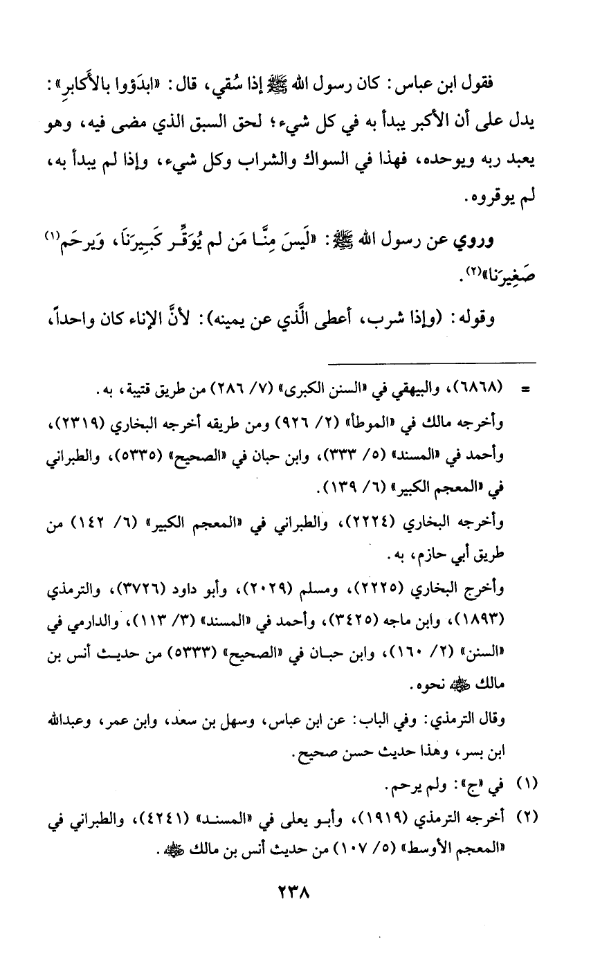 فقول ابن عباس: كان رسول الله صلى الله عليه وسلم إذا سقي، قال: ((ابدؤوا بالأكابر)): يدل على أن الأكبر يبدأ به في كل شيء؛ لحق السبق الذي مضى فيه، وهو يعبد ربه ويوحده، فهذا في السواك والشراب وكل شيء، وإذا لم يبدأ به، لم يوقروه.
