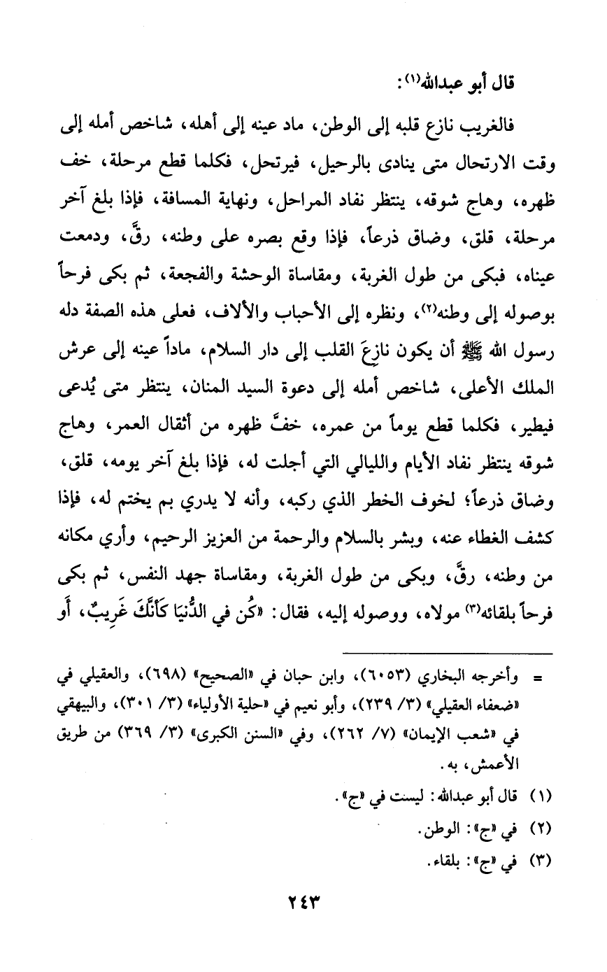 فالغريب نازع قلبه إلى الوطن، ماد عينه إلى أهله، شاخص أمله إلى وقت الارتحال متى ينادى بالرحيل، فيرتحل، فكلما قطع مرحلة، خف ظهره، وهاج شوقه، ينتظر نفاد المراحل، ونهاية المسافة، فإذا بلغ آخر مرحلة، قلق، وضاق ذرعاً، فإذا وقع بصره على وطنه، رق، ودمعت عيناه، فبكى من طول الغربة، ومقاساة الوحشة والفجعة، ثم بكى فرحاً بوصوله إلى وطنه، ونظره إلى الأحباب والألاف، فعلى هذه الصفة دله رسول الله صلى الله عليه وسلم أن يكون نازع القلب إلى دار السلام، ماداً عينه إلى عرش الملك الأعلى، شاخص أمله إلى دعوة السيد المنان، ينتظر متى يدعى فيطير، فكلما قطع يوماً من عمره، خف ظهره من أثقال العمر، وهاج شوقه ينتظر نفاد الأيام والليالي التي أجلت له، فإذا بلغ آخر يومه، قلق، وضاق ذرعاً؛ لخوف الخطر الذي ركبه، وأنه لا يدري بم يختم له، فإذا كشف الغطاء عنه، وبشر بالسلام والرحمة من العزيز الرحيم، وأري مكانه من وطنه، رق، وبكى من طول الغربة، ومقاساة جهد النفس، ثم بكى فرحاً بلقائه مولاه، ووصوله إليه، فقال: ((كن في الدنيا كأنك غريبٌ، أو