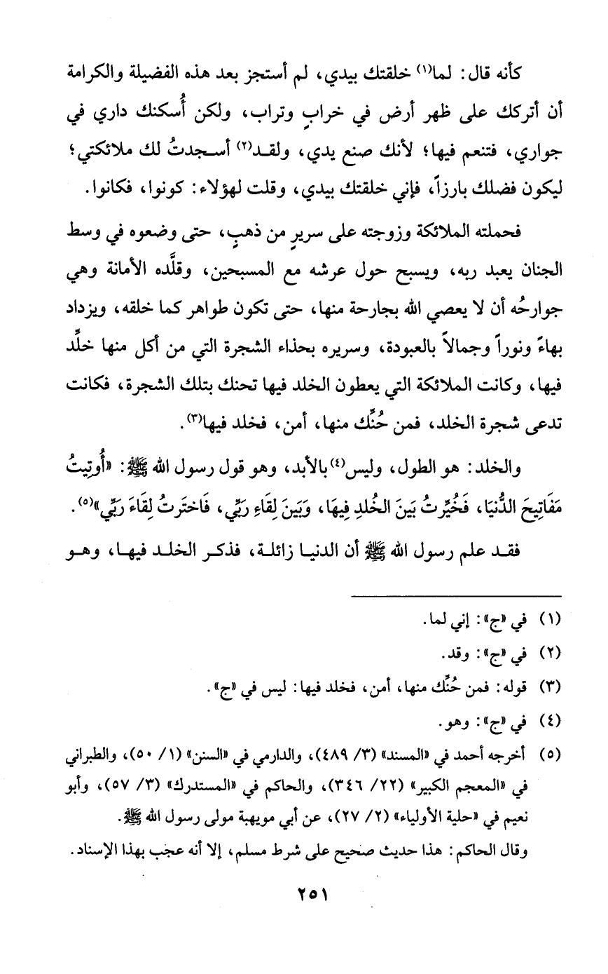 كأنه قال: لما خلقتك بيدي، لم أستجز بعد هذه الفضيلة والكرامة أن أتركك على ظهر أرض في خرابٍ وتراب، ولكن أسكنك داري في جواري، فتنعم فيها؛ لأنك صنع يدي، ولقد أسجدت لك ملائكتي؛ ليكون فضلك بارزاً، فإني خلقتك بيدي، وقلت لهؤلاء: كونوا، فكانوا.