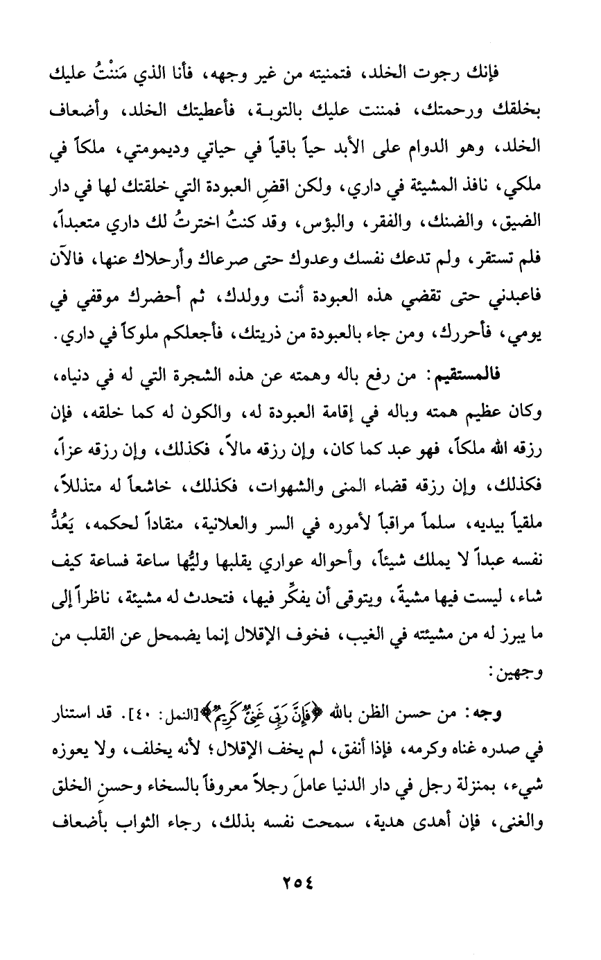 فالمستقيم: من رفع باله وهمته عن هذه الشجرة التي له في دنياه، وكان عظيم همته وباله في إقامة العبودة له، والكون له كما خلقه، فإن رزقه الله ملكاً، فهو عبد كما كان، وإن رزقه مالاً، فكذلك، وإن رزقه عزاً، فكذلك، وإن رزقه قضاء المنى والشهوات، فكذلك، خاشعاً له متذللاً، ملقياً بيديه، سلماً مراقباً لأموره في السر والعلانية، منقاداً لحكمه، يعد نفسه عبداً لا يملك شيئاً، وأحواله عواري يقلبها وليها ساعة فساعة كيف شاء، ليست فيها مشيةً، ويتوقى أن يفكر فيها، فتحدث له مشيئة، ناظراً إلى ما يبرز له مشيئته في الغيب، فخوف الإقلال إنما يضمحل عن القلب من وجهين: