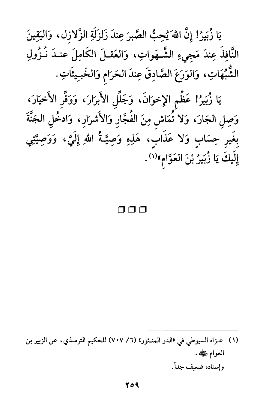 يا زبير! إن الله يحب الصبر عند زلزلة الزلازل، واليقين النافذ عند مجيء الشهوات، والعقل الكامل عند نزول الشبهات، والورع الصادق عند الحرام والخبيثات.