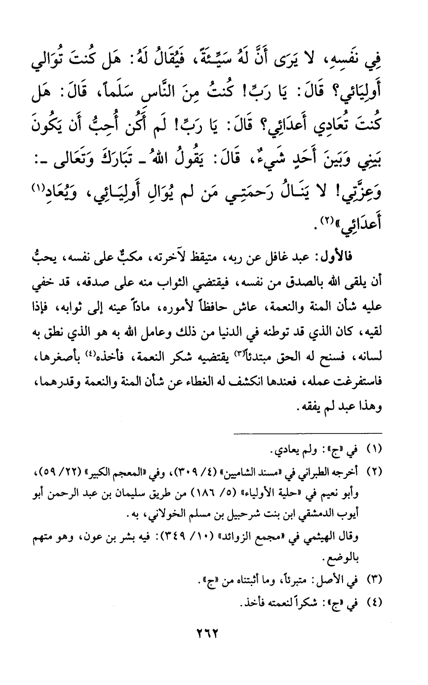 في نفسه، لا يرى أن له سيئةً، فيقال له: هل كنت توالي أوليائي؟ قال: يا رب! كنت من الناس سلماً، قال: هل كنت تعادي أعدائي؟ قال: يا رب! لم أكن أحب أن يكون بيني وبين أحدٍ شيءٌ، قال: يقول الله -تبارك وتعالى-: وعزتي! لا ينال رحمتي من لم يوال أوليائي، ويعاد أعدائي)).