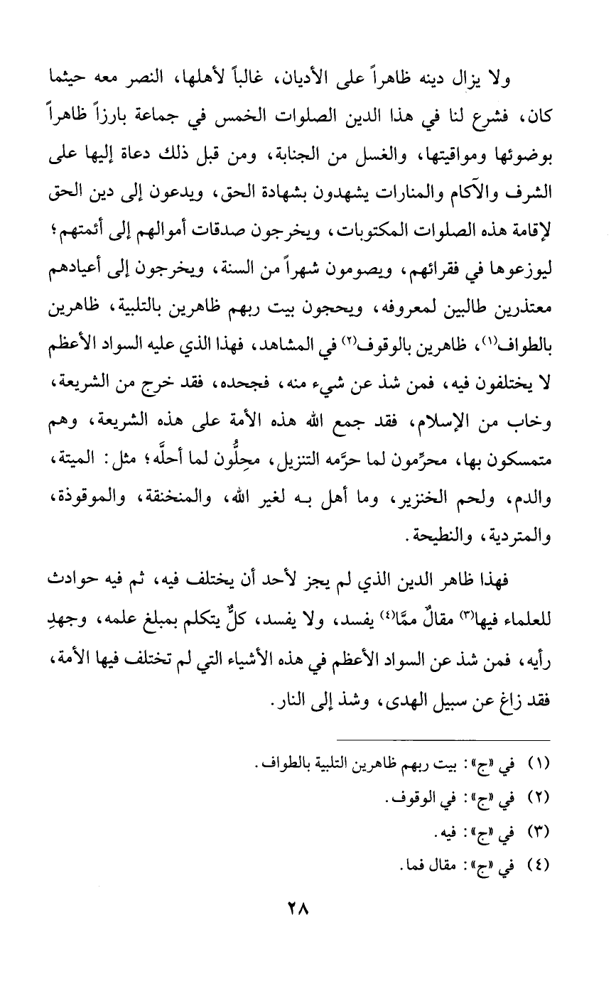 ولا يزال دينه ظاهراً على الأديان، غالباً لأهلها، النصر معه حيثما كان، فشرع لنا في هذا الدين الصلوات الخمس في جماعة بارزاً ظاهراً بوضوئها ومواقيتها، والغسل من الجنابة، ومن قبل ذلك دعاة إليها على الشرف والآكام والمنارات يشهدون بشهادة الحق، ويدعون إلى دين الحق لإقامة هذه الصلوات المكتوبات، ويخرجون صدقات أموالهم إلى أئمتهم؛ ليوزعوها في فقرائهم، ويصومون شهراً من السنة، ويخرجون إلى أعيادهم معتذرين طالبين لمعروفه، ويحجون بيت ربهم ظاهرين بالتلبية، ظاهرين بالطواف، ظاهرين بالوقوف في المشاهد، فهذا الذي عليه السواد الأعظم لا يختلفون فيه، فمن شذ عن شيء منه، فجحده، فقد خرج من الشريعة، وخاب من الإسلام، فقد جمع الله هذه الأمة على هذه الشريعة، وهم متمسكون بها، محرمون لما حرمه التنزيل، محلون لما أحله؛ مثل: الميتة، والدم، ولحم الخنزير، وما أهل به لغير الله، والمنخنقة، والموقوذة، والمتردية، والنطيحة.