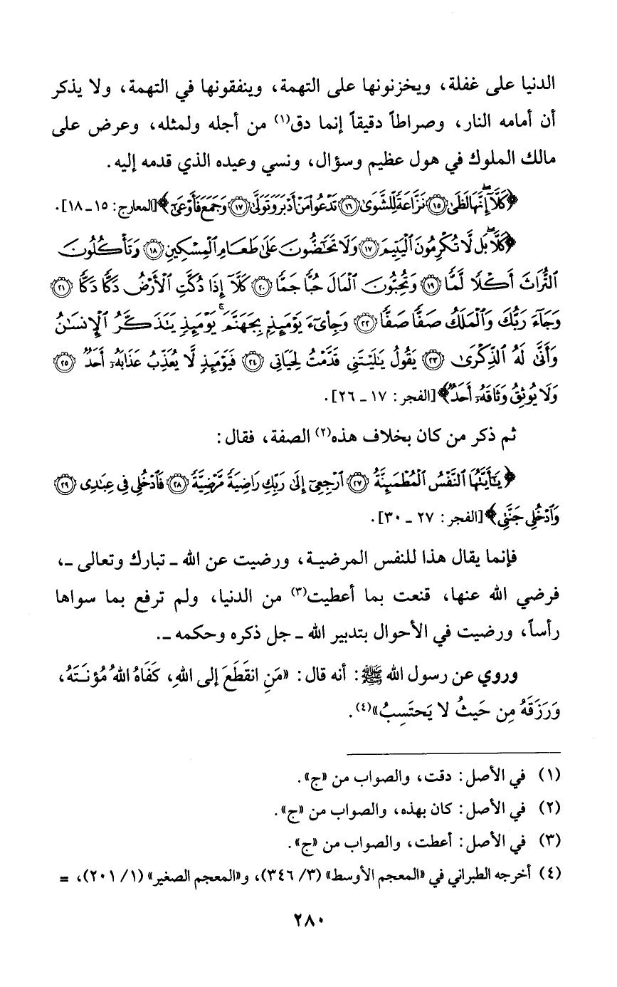 {كلا بل لا تكرمون اليتيم. ولا تحاضون على طعام المسكين. وتأكلون التراث أكلاً لما. وتحبون المال حباً جماً. كلا إذا دكت الأرض دكاً دكا. وجاء ربك والملك صفاً صفا. وجيء يومئذٍ بجهنم يومئذٍ يتذكر الإنسان وأنى له الذكرى. يقول يا ليتني قدمت لحياتي. فيومئذٍ لا يعذب عذابه أحدٌ. ولا يوثق وثاقه أحدٌ}.