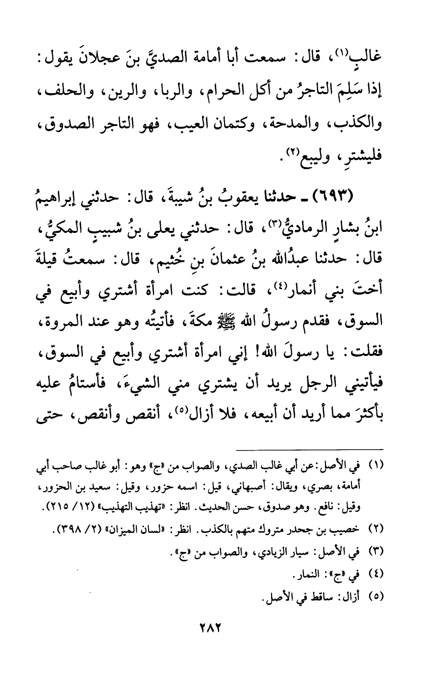693 - حدثنا يعقوب بن شيبة، قال: حدثني إبراهيم ابن بشارٍ الرمادي، قال: حدثني يعلى بن شبيبٍ المكي، قال: حدثنا عبد الله بن عثمان بن خثيم، قال: سمعت قيلة أخت بني أنمار، قالت: كنت امرأة أشتري وأبيع في السوق، فقدم رسول الله صلى الله عليه وسلم مكة، فأتيته وهو عند المروة، فقلت: يا رسول الله! إني امرأة أشتري وأبيع في السوق، فيأتيني الرجل يريد أن يشتري مني الشيء، فأستام عليه بأكثر مما أريد أن أبيعه، فلا أزال، أنقص وأنقص، حتى