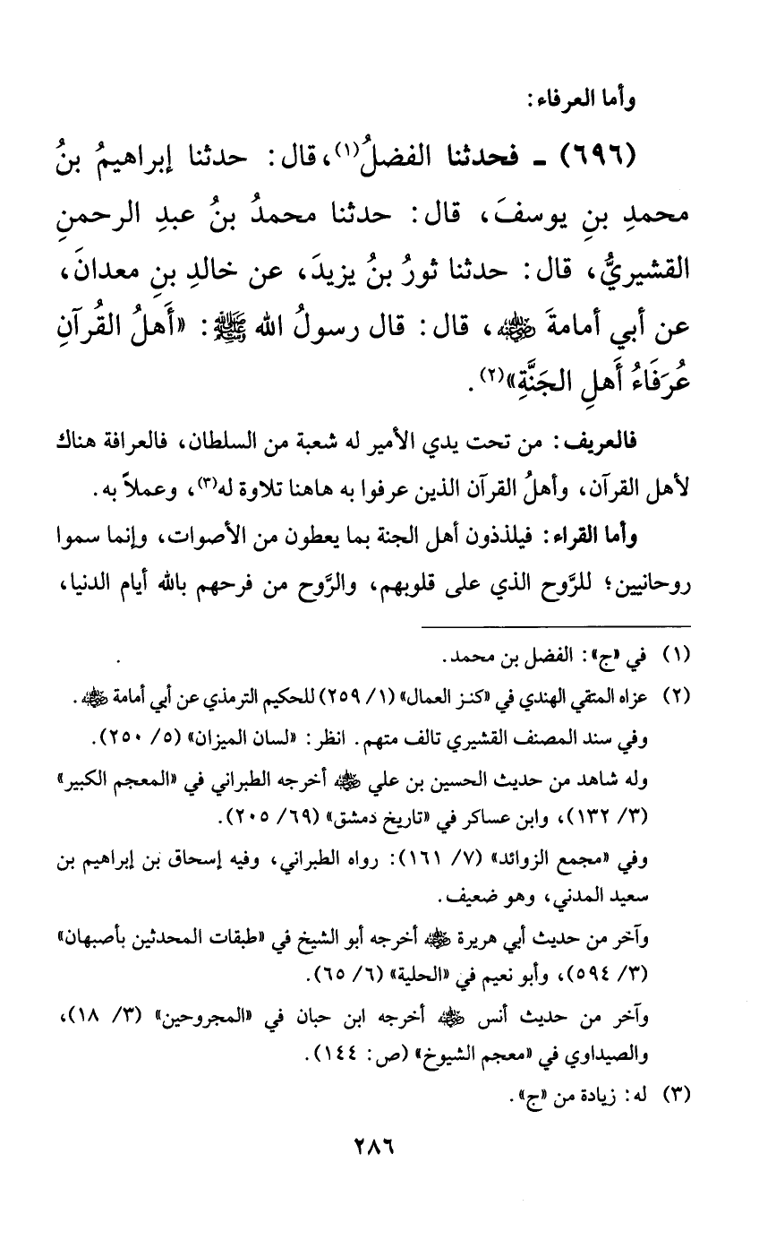 696 - فحدثنا الفضل، قال: حدثنا إبراهيم بن محمد بن يوسف، قال: حدثنا محمد بن عبد الرحمن القشيري، قال: حدثنا ثور بن يزيد، عن خالد بن معدان، عن أبي أمامة رضي الله عنه، قال: قال رسول الله صلى الله عليه وسلم: ((أهل القرآن عرفاء أهل الجنة)).