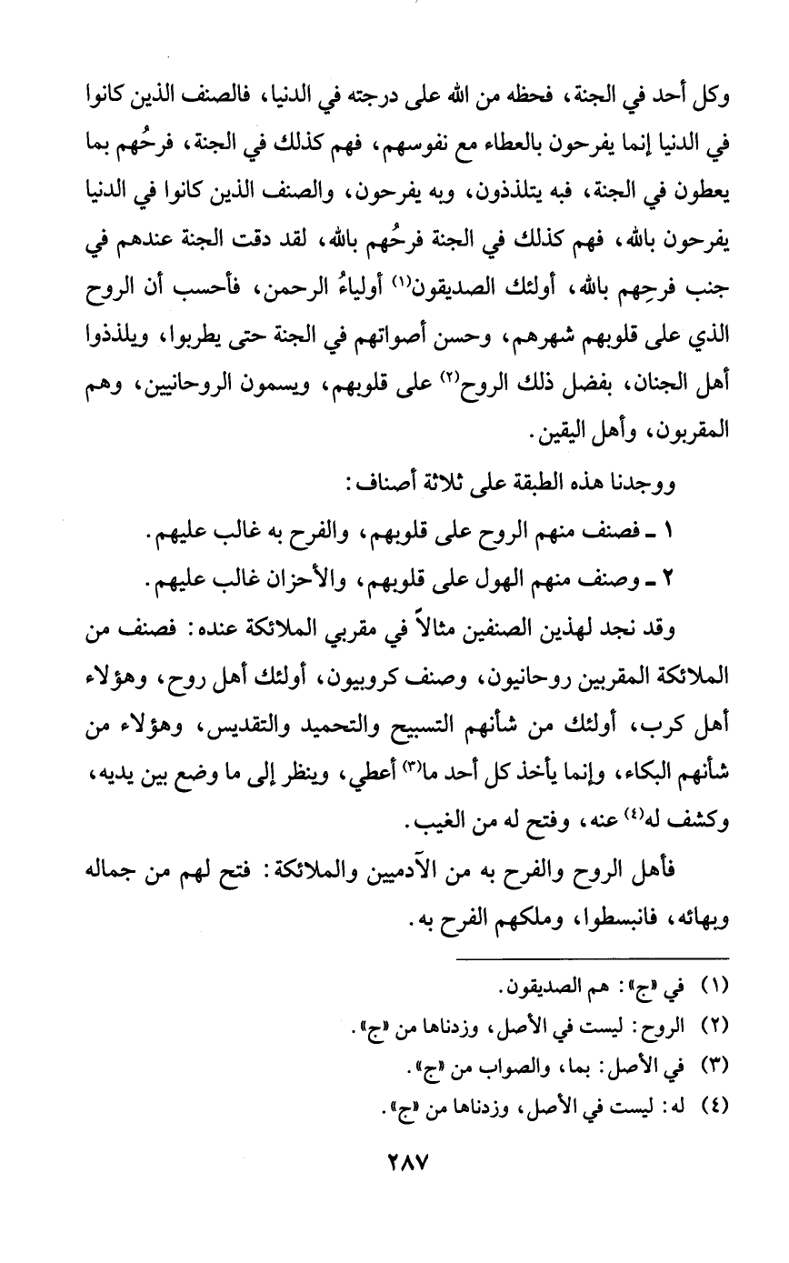وكل أحد في الجنة، فحظه من الله على درجته في الدنيا، فالصنف الذين كانوا في الدنيا إنما يفرحون بالعطاء مع نفوسهم، فهم كذلك في الجنة، فرحهم بما يعطون في الجنة، فبه يتلذذون، وبه يفرحون، والصنف الذين كانوا في الدنيا يفرحون بالله، فهم كذلك في الجنة فرحهم بالله، لقد دقت الجنة عندهم في جنب فرحهم بالله، أولئك الصديقون أولياء الرحمن، فأحسب أن الروح الذي على قلوبهم شهرهم، وحسن أصواتهم في الجنة حتى يطربوا، ويلذذوا أهل الجنان، بفضل ذلك الروح على قلوبهم، ويسمون الروحانيين، وهم المقربون، وأهل اليقين.