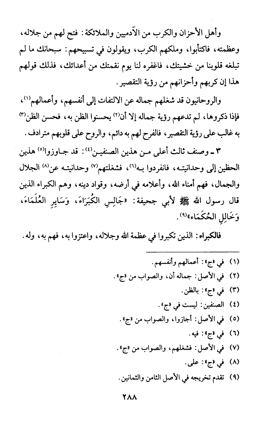 3 - وصنف ثالث أعلى من هذين الصنفين: قد جاوزوا هذين الحظين إلى وحدانيته، فانفردوا به، فشغلتهم وحدانيته عن الجلال والجمال، فهم أمناء الله، وأعلامه في أرضه، وقواد دينه، وهم الكبراء الذين قال رسول الله صلى الله عليه وسلم لأبي جحيفة: ((جالس الكبراء، وساير العلماء، وخالل الحكماء)).