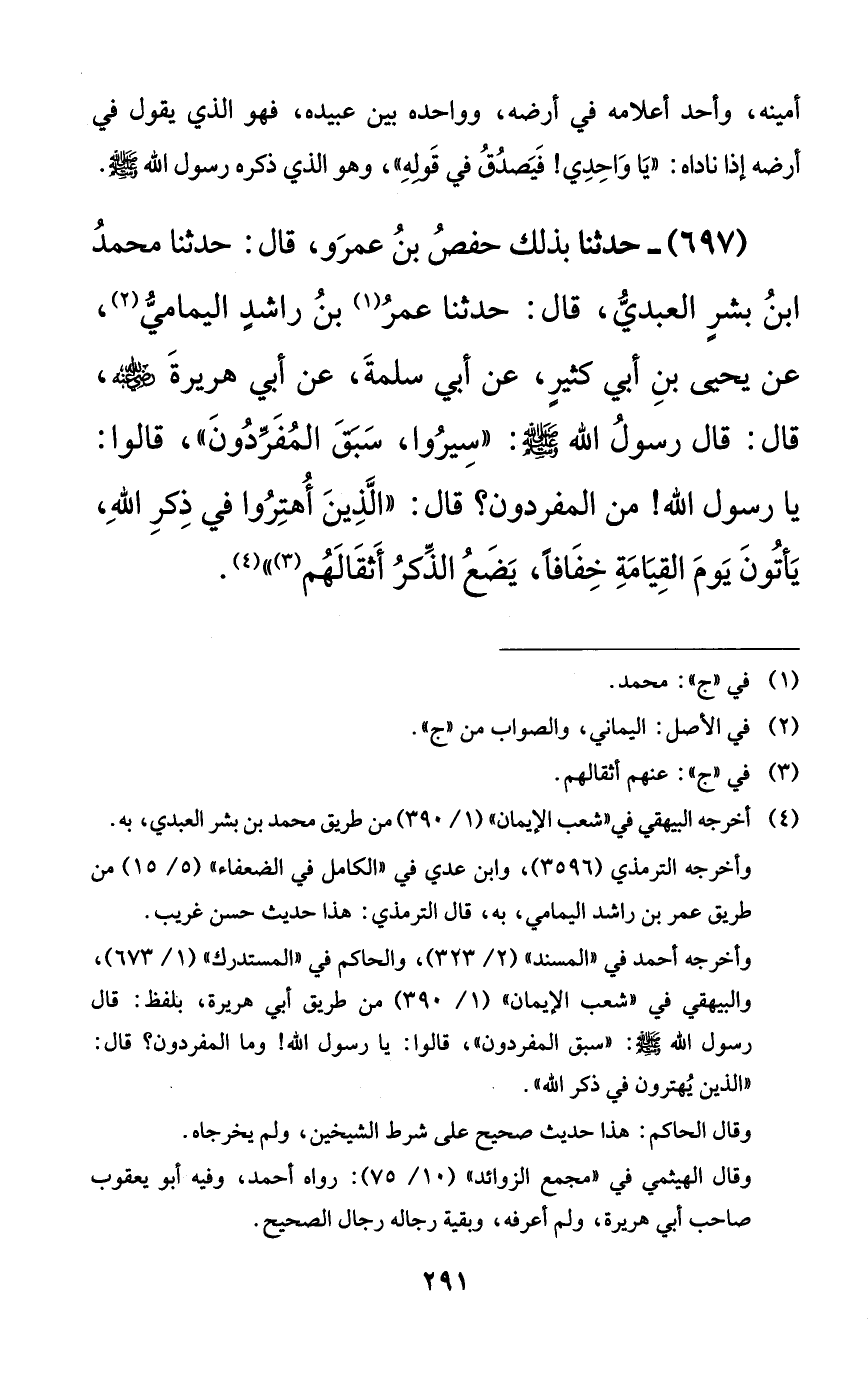 697 - حدثنا بذلك حفص بن عمرو، قال: حدثنا محمد ابن بشرٍ العبدي، قال: حدثنا عمر بن راشدٍ اليمامي، عن يحيى بن أبي كثيرٍ، عن أبي سلمة، عن أبي هريرة رضي الله عنه، قال: قال رسول الله صلى الله عليه وسلم: ((سيروا، سبق المفردون))، قالوا: يا رسول الله! من المفردون؟ قال: ((الذين أهتروا في ذكر الله، يأتون يوم القيامة خفافاً، يضع الذكر أثقالهم)).