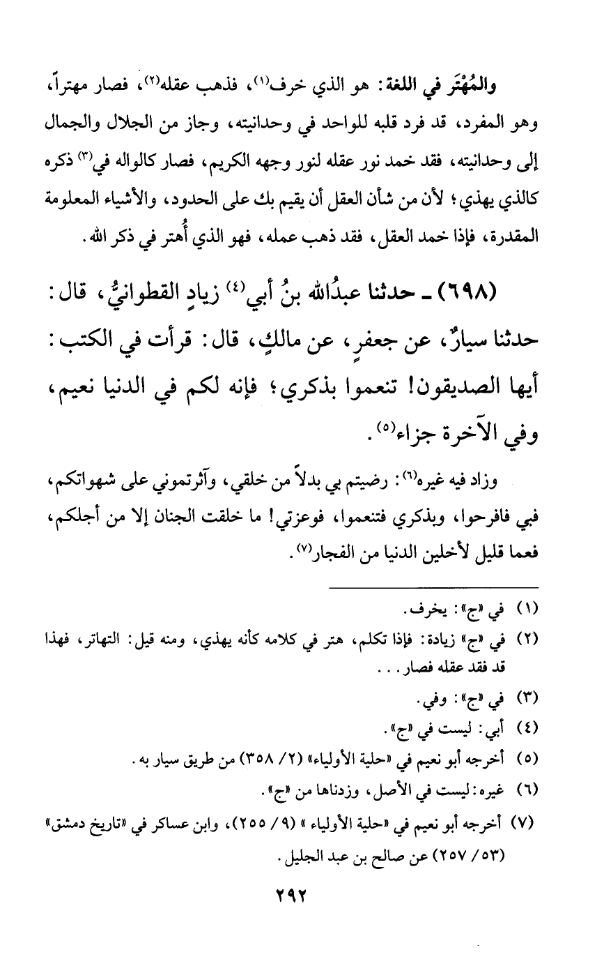 698 - حدثنا عبد الله بن أبي زيادٍ القطواني، قال: حدثنا سيارٌ، عن جعفرٍ، عن مالكٍ، قال: قرأت في الكتب: أيها الصديقون! تنعموا بذكري؛ فإنه لكم في الدنيا نعيم، وفي الآخرة جزاء.