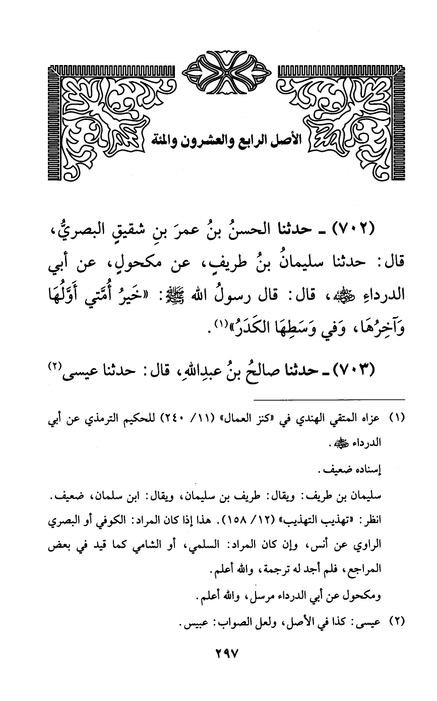 702 - حدثنا الحسن بن عمر بن شقيقٍ البصري، قال: حدثنا سليمان بن طريفٍ، عن مكحولٍ، عن أبي الدرداء رضي الله عنه، قال: قال رسول الله صلى الله عليه وسلم: ((خير أمتي أولها وآخرها، وفي وسطها الكدر)).