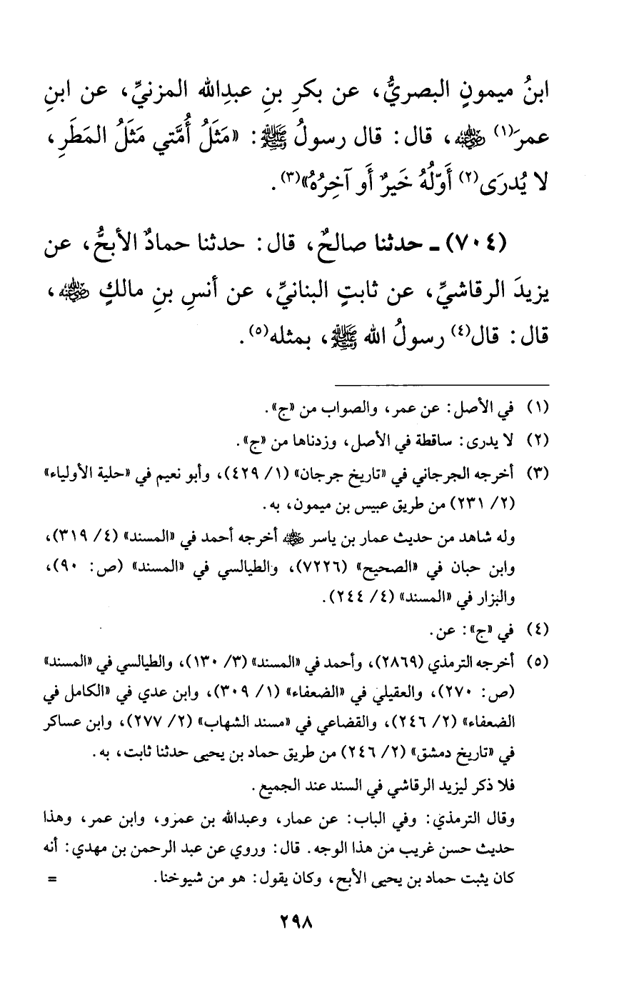 ابن ميمون البصري، عن بكر بن عبد الله المزني، عن ابن عمر رضي الله عنه، قال: قال رسول الله صلى الله عليه وسلم: ((مثل أمتي مثل المطر، لا يدرى أوله خيرٌ أو آخره)).