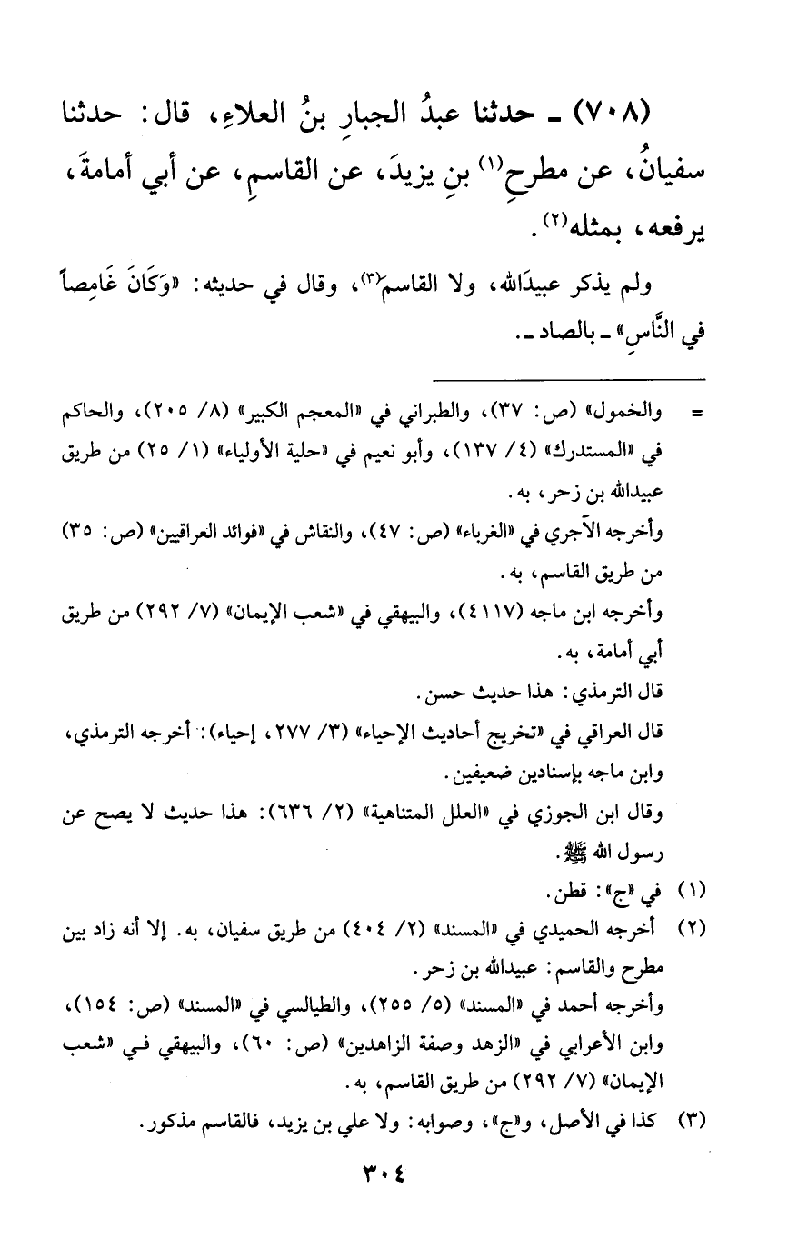 708 - حدثنا عبد الجبار بن العلاء، قال: حدثنا سفيان، عن مطرح بن يزيد، عن القاسم، عن أبي أمامة، يرفعه، بمثله.