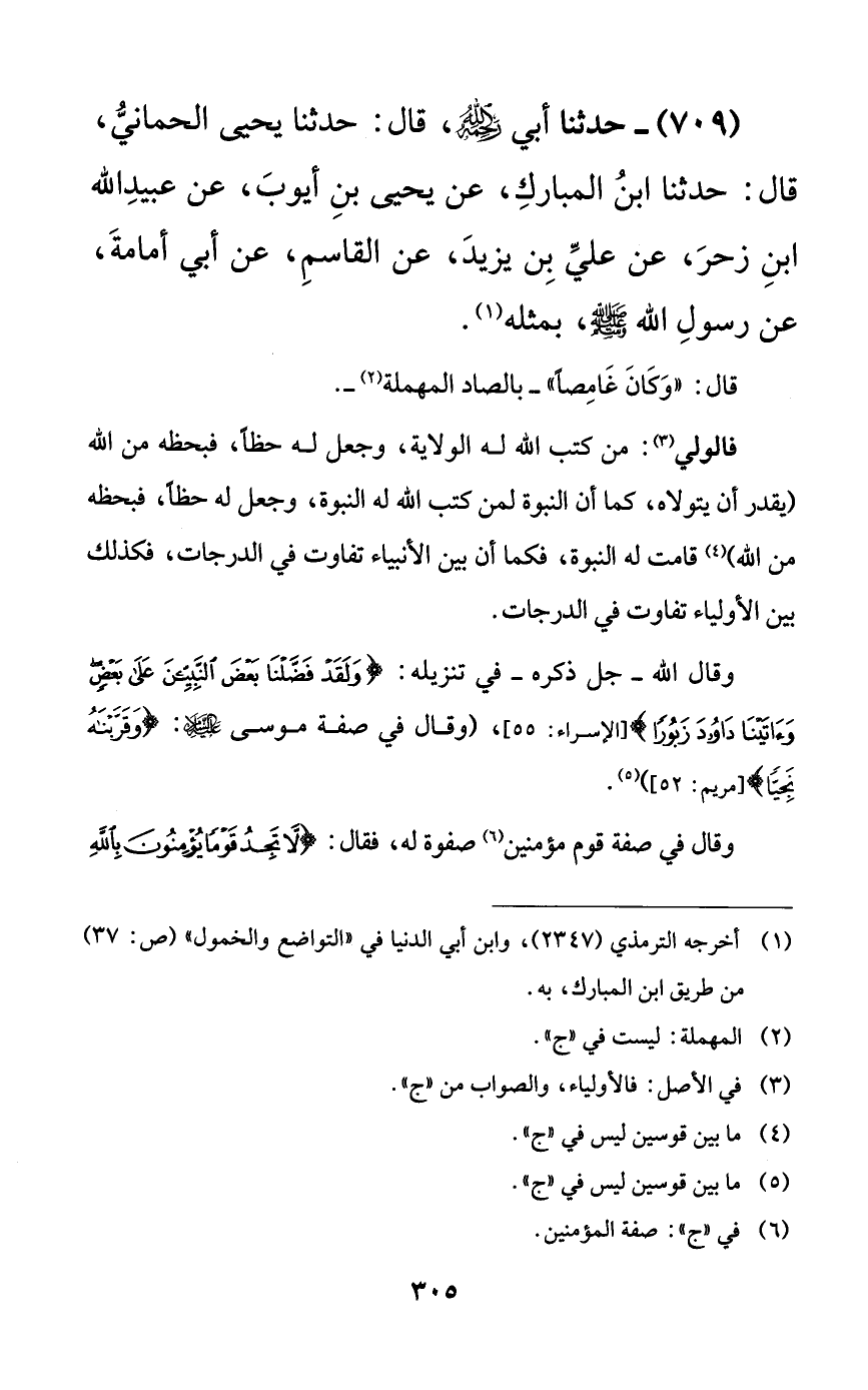 709 - حدثنا أبي رحمه الله، قال: حدثنا يحيى الحماني، قال: حدثنا ابن المبارك، عن يحيى بن أيوب، عن عبيد الله ابن زحر، عن علي بن يزيد، عن القاسم، عن أبي أمامة، عن رسول الله صلى الله عليه وسلم، بمثله.