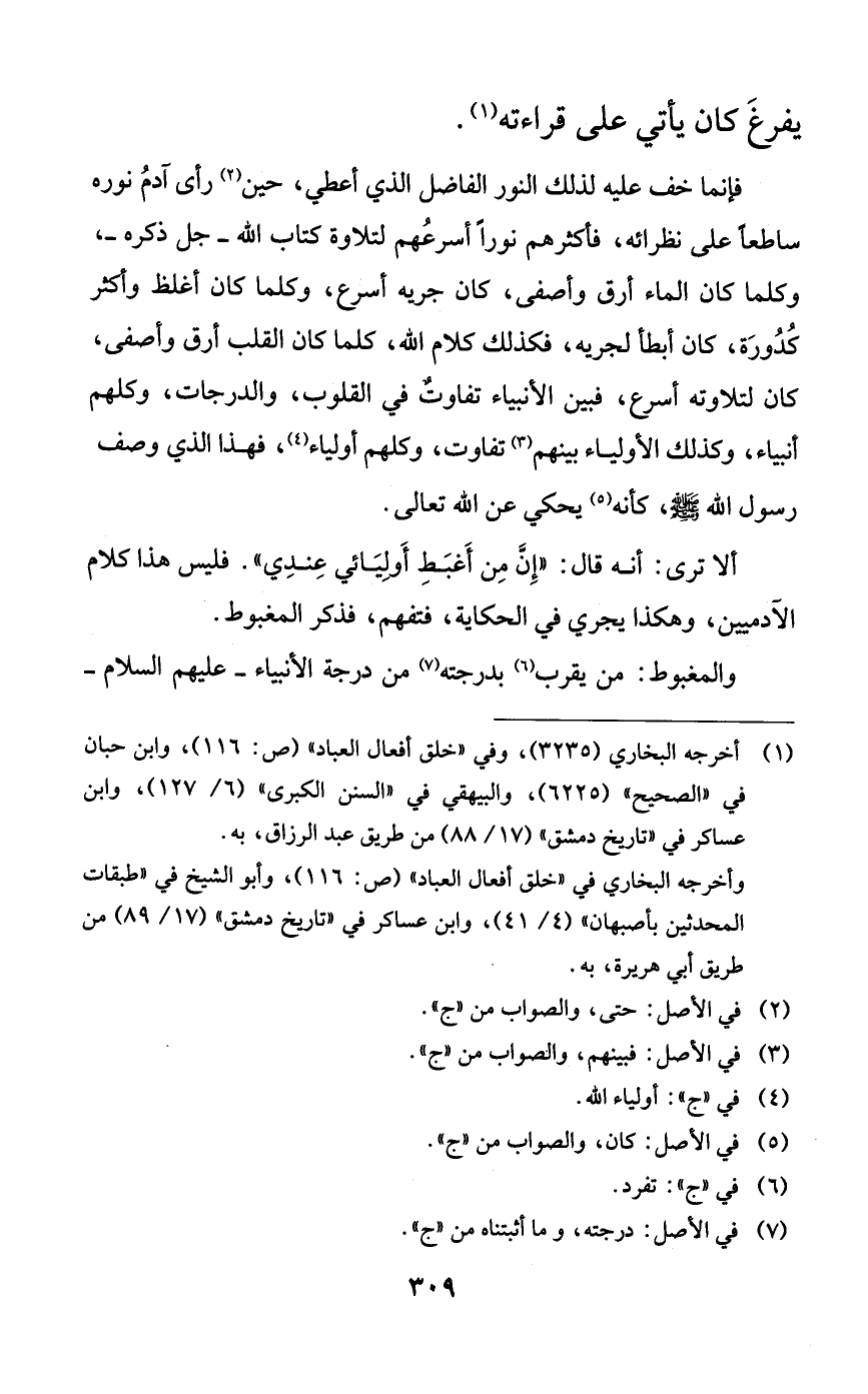 فإنما خف عليه لذلك النور الفاضل الذي أعطي، حين رأى آدم نوره ساطعاً على نظرائه، فأكثرهم نوراً أسرعهم لتلاوة كتاب الله -جل ذكره-، وكلما كان الماء أرق وأصفى، كان جريه أسرع، وكلما كان أغلظ وأكثر كدورة، كان أبطأ لجريه، فكذلك كلام الله، كلما كان القلب أرق وأصفى، كان لتلاوته أسرع، فبين الأنبياء تفاوتٌ في القلوب، والدرجات، وكلهم أنبياء، وكذلك الأولياء بينهم تفاوت، وكلهم أولياء، فهذا الذي وصف رسول الله صلى الله عليه وسلم، كأنه يحكي عن الله تعالى.