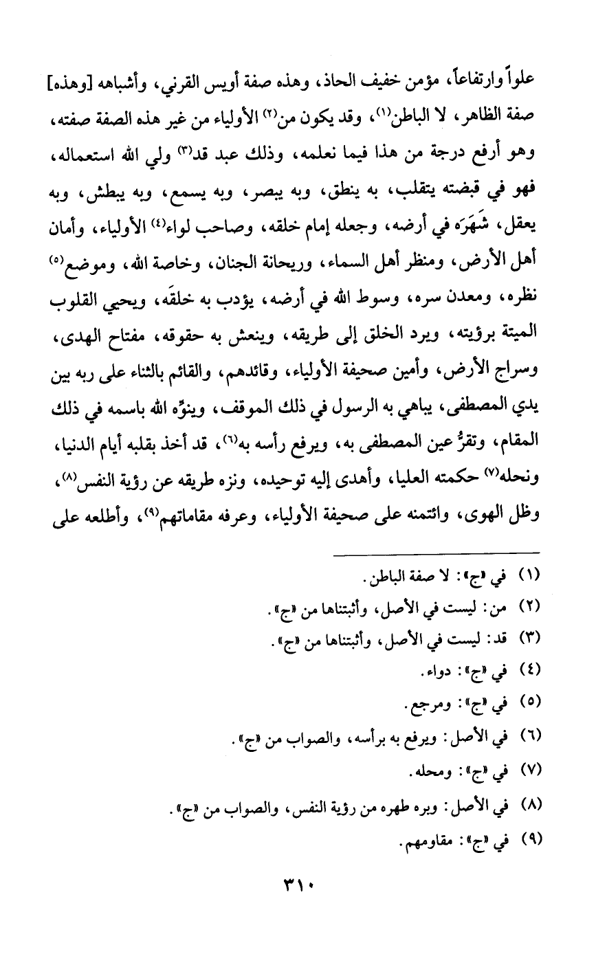 علواً وارتفاعاً، مؤمن خفيف الحاذ، وهذه صفة أويس القرني، وأشباهه [وهذه] صفة الظاهر، لا الباطن، وقد يكون من الأولياء من غير هذه الصفة صفته، وهو أرفع درجة من هذا فيما نعلمه، وذلك عبد قد ولي الله استعماله، فهو في قبضته يتقلب، به ينطق، وبه يبصر، وبه يسمع، وبه يبطش، وبه يعقل، شهره في أرضه، وجعله إمام خلقه، وصاحب لواء الأولياء، وأمان أهل الأرض، ومنظر أهل السماء، وريحانة الجنان، وخاصة الله، وموضع نظره، ومعدن سره، وسوط الله في أرضه، يؤدب به خلقه، ويحيي القلوب الميتة برؤيته، ويرد الخلق إلى طريقه، وينعش به حقوقه، مفتاح الهدى، وسراج الأرض، وأمين صحيفة الأولياء، وقائدهم، والقائم بالثناء على ربه بين يدي المصطفى، يباهي به الرسول في ذلك الموقف، وينوه الله باسمه في ذلك المقام، وتقر عين المصطفى به، ويرفع رأسه به، قد أخذ بقلبه أيام الدنيا، ونحله حكمته العليا، وأهدى إليه توحيده، ونزه طريقه عن رؤية النفس، وظل الهوى، وائتمنه على صحيفة الأولياء، وعرفه مقاماتهم، وأطلعه على