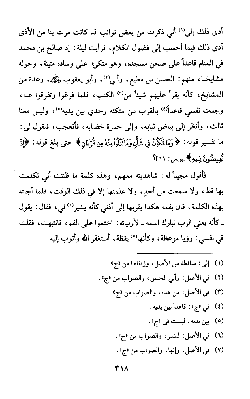أدى ذلك إلى أني ذكرت من بعض نوائب قد كانت مرت بنا من الأذى أدى ذلك فيما أحسب إلى فضول الكلام، فرأيت ليلة: إذ صالح بن محمد في المنام قاعداً على صحن مسجده، وهو متكئ على وسادة متينة، وحوله مشايخنا، منهم: الحسن بن مطيع، وأبي، وأبو يعقوب رحمه الله، وعدة من المشايخ، كأنه يقرأ عليهم شيئاً من الكتب، فلما فرغوا وتفرقوا عنه، وجدت نفسي قاعداً بالقرب من متكئه وحدي بين يديه، وليس معنا ثالث، وأنظر إلى بياض ثيابه، وإلى حمرة خضابه، فأتعجب، فيقول لي: ما تفسير قوله: {وما تكون في شأنٍ وما تتلوا منه من قرآنٍ} حتى بلغ قوله: {إذ تفيضون فيه}؟