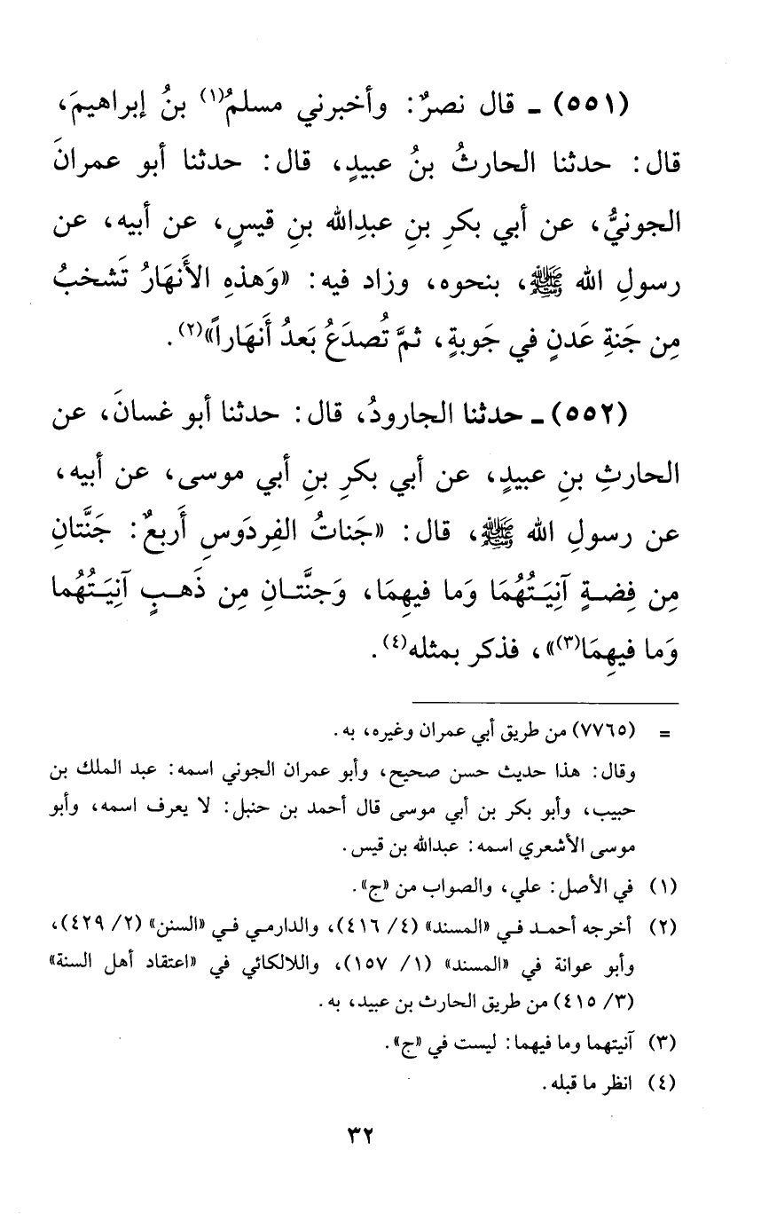 551 - قال نصرٌ: وأخبرني مسلم بن إبراهيم، قال: حدثنا الحارث بن عبيدٍ، قال: حدثنا أبو عمران الجوني، عن أبي بكر بن عبد الله بن قيسٍ، عن أبيه، عن رسول الله صلى الله عليه وسلم، بنحوه، وزاد فيه: ((وهذه الأنهار تشخب من جنة عدنٍ في جوبةٍ، ثم تصدع بعد أنهاراً)).
