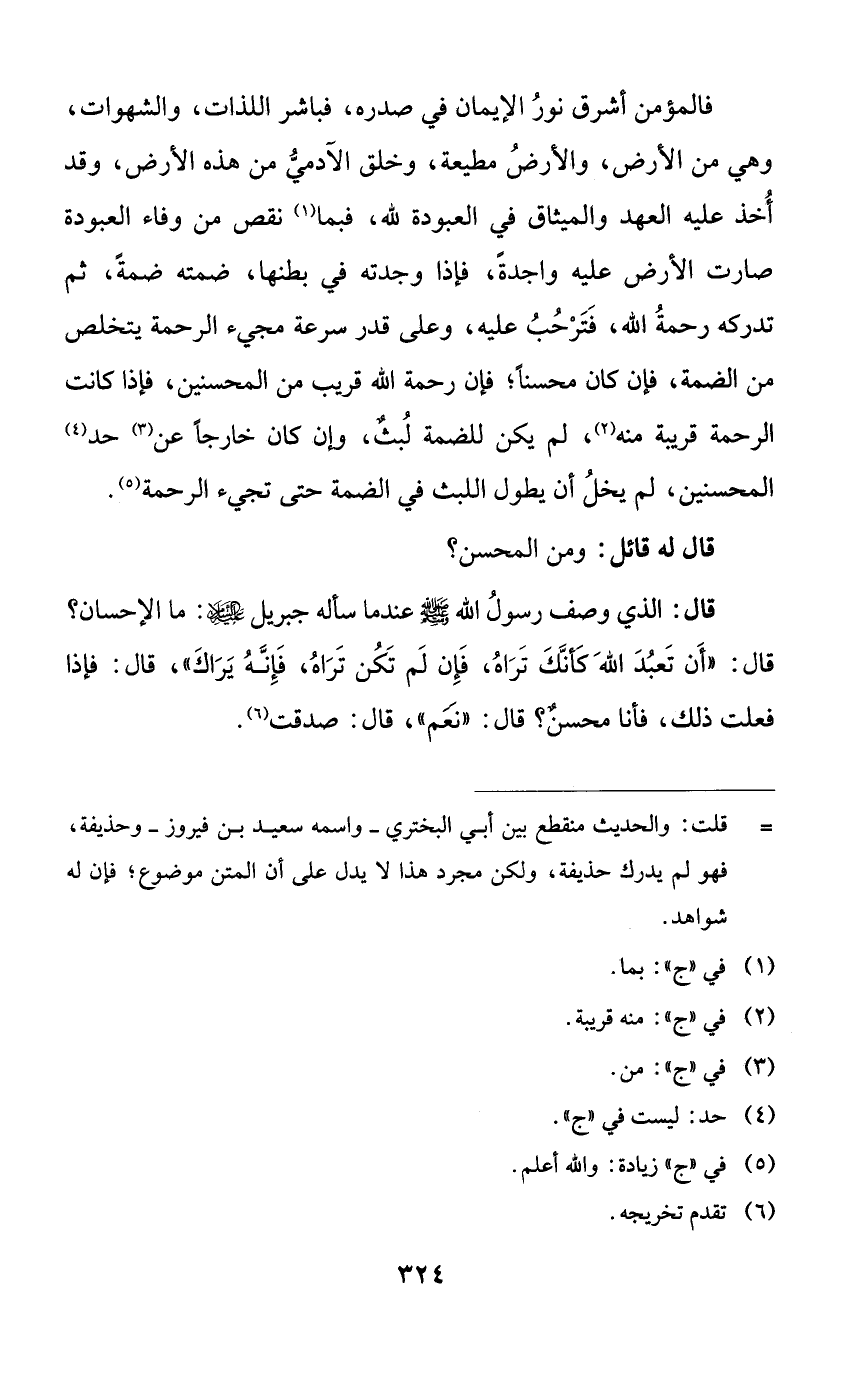 قال: الذي وصف رسول الله صلى الله عليه وسلم عندما سأله جبريل عليه السلام: ما الإحسان؟ قال: ((أن تعبد الله كأنك تراه، فإن لم تكن تراه، فإنه يراك))، قال: فإذا فعلت ذلك، فأنا محسنٌ؟ قال: ((نعم))، قال: صدقت.