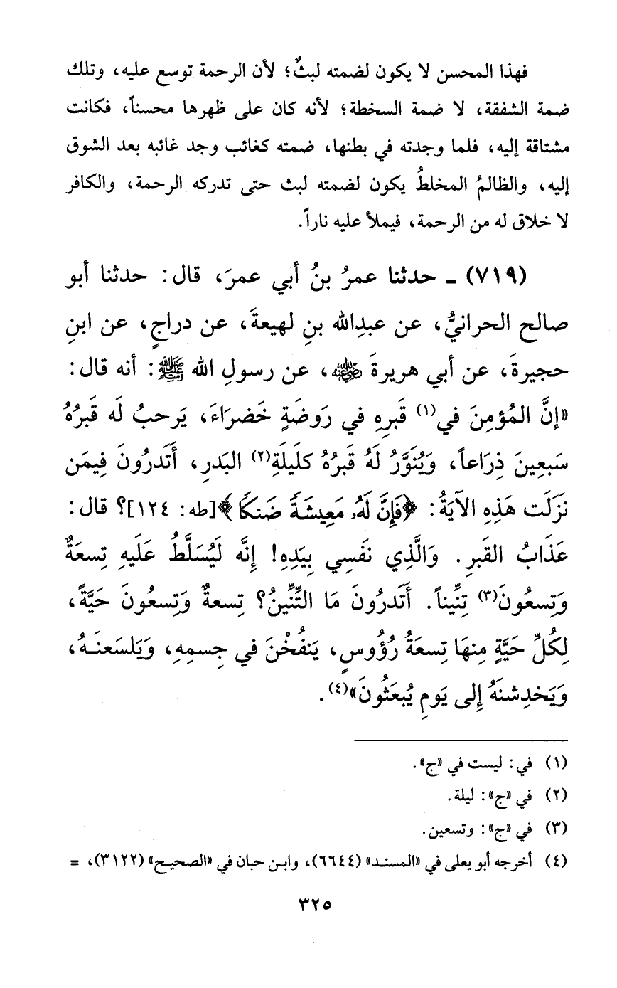719 - حدثنا عمر بن أبي عمر، قال: حدثنا أبو صالح الحراني، عن عبد الله بن لهيعة، عن دراجٍ، عن ابن حجيرة، عن أبي هريرة رضي الله عنه، عن رسول الله صلى الله عليه وسلم: أنه قال: ((إن المؤمن في قبره في روضةٍ خضراء، يرحب له قبره سبعين ذراعاً، وينور له قبره كليلة البدر، أتدرون فيمن نزلت هذه الآية: {فإن له معيشةً ضنكا}؟ قال: عذاب القبر. والذي نفسي بيده! إنه ليسلط عليه تسعةٌ وتسعون تنيناً. أتدرون ما التنين؟ تسعةٌ وتسعون حيةً، لكل حيةٍ منها تسعة رؤوسٍ، ينفخن في جسمه، ويلسعنه، ويخدشنه إلى يوم يبعثون)).