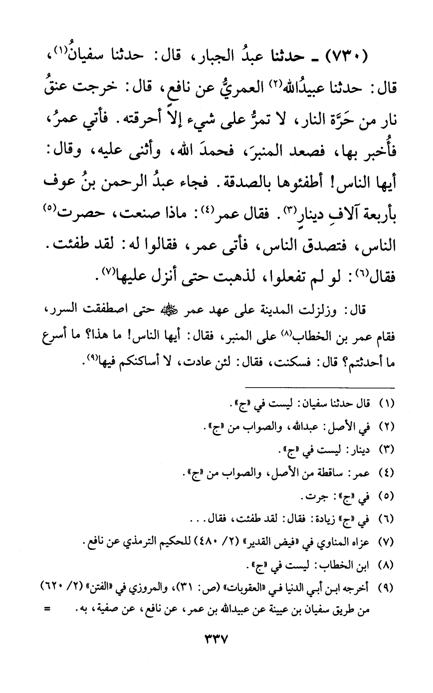 730 - حدثنا عبد الجبار، قال: حدثنا سفيان، قال: حدثنا عبيد الله العمري عن نافعٍ، قال: خرجت عنق نار من حرة النار، لا تمر على شيء إلا أحرقته. فأتي عمر، فأخبر بها، فصعد المنبر، فحمد الله، وأثنى عليه، وقال: أيها الناس! أطفئوها بالصدقة. فجاء عبد الرحمن بن عوف بأربعة آلاف دينارٍ. فقال عمر: ماذا صنعت، حصرت الناس، فتصدق الناس، فأتى عمر، فقالوا له: لقد طفئت. فقال: لو لم تفعلوا، لذهبت حتى أنزل عليها.