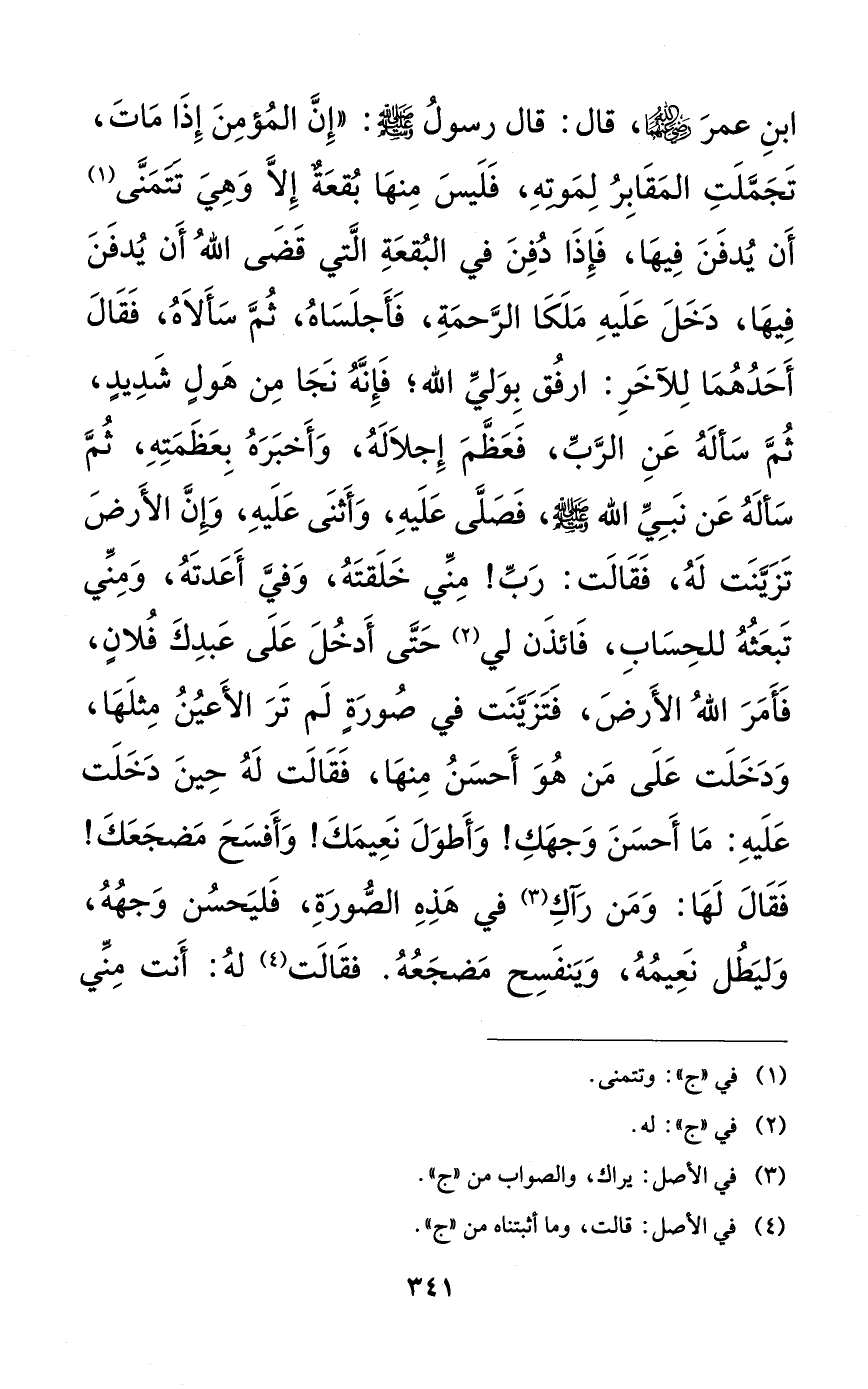 ابن عمر رضي الله عنهما، قال: قال رسول الله صلى الله عليه وسلم: ((إن المؤمن إذا مات تجملت المقابر لموته، فليس منها بقعةٌ إلا وهي تتمنى أن يدفن فيها، فإذا دفن في البقعة التي قضى الله أن يدفن فيها، دخل عليه ملكا الرحمة، فأجلساه، ثم سألاه، فقال أحدهما للآخر: ارفق بولي الله؛ فإنه نجا من هولٍ شديدٍ، ثم سأله عن الرب، فعظم إجلاله، وأخبره بعظمته، ثم سأله عن نبي الله صلى الله عليه وسلم، فصلى عليه، وأثنى عليه، وإن الأرض تزينت له، فقالت: رب! مني خلقته، وفي أعدته، ومني تبعثه للحساب، فائذن لي حتى أدخل على عبدك فلانٍ، فأمر الله الأرض، فتزينت في صورةٍ لم تر الأعين مثلها، ودخلت على من هو أحسن منها، فقالت له حين دخلت عليه: ما أحسن وجهك! وأطول نعيمك! وأفسح مضجعك! فقال لها: ومن رآك في هذه الصورة، فليحسن وجهه، وليطل نعيمه، وينفسح مضجعه. فقالت له: أنت مني