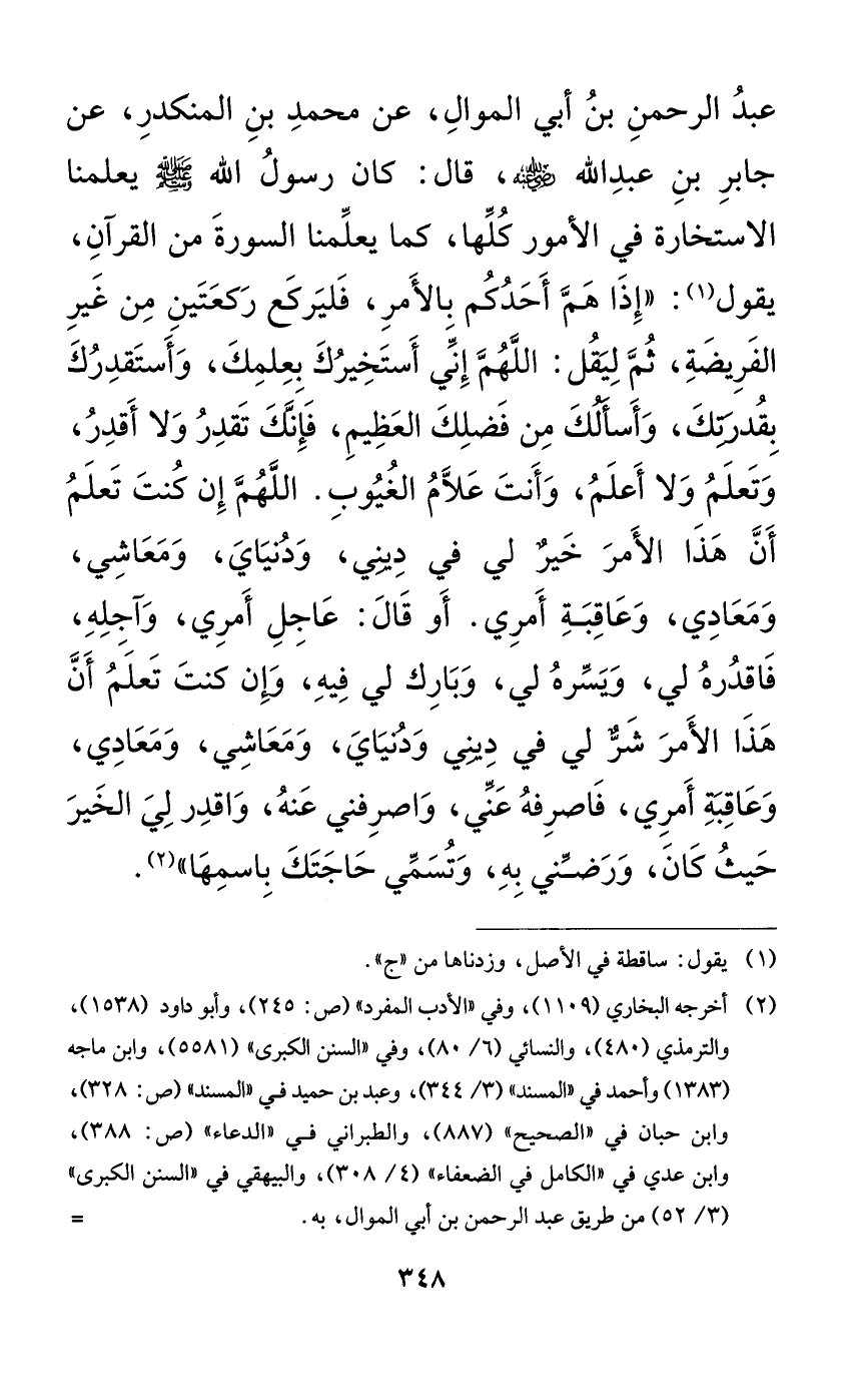 عبد الرحمن بن أبي الموال، عن محمد بن المنكدر، عن جابر بن عبد الله رضي الله عنه، قال: كان رسول الله صلى الله عليه وسلم يعلمنا الاستخارة في الأمور كلها، كما يعلمنا السورة من القرآن، يقول: ((إذا هم أحدكم بالأمر، فليركع ركعتين من غير الفريضة، ثم ليقل: اللهم إني أستخيرك بعلمك، وأستقدرك بقدرتك، وأسألك من فضلك العظيم، فإنك تقدر ولا أقدر، وتعلم ولا أعلم، وأنت علام الغيوب. اللهم إن كنت تعلم أن هذا الأمر خيرٌ لي في ديني، ودنياي، ومعاشي، ومعادي، وعاقبة أمري. أو قال: عاجل أمري، وآجله، فاقدره لي، ويسره لي، وبارك لي فيه، وإن كنت تعلم أن هذا الأمر شرٌّ لي في ديني ودنياي، ومعاشي، ومعادي، وعاقبة أمري، فاصرفه عني، واصرفني عنه، واقدر لي الخير حيث كان، ورضني به، وتسمي حاجتك باسمها)).