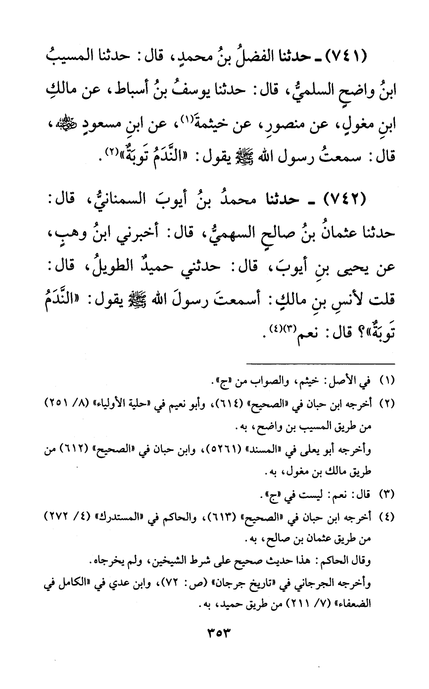 741 - حدثنا الفضل بن محمدٍ، قال: حدثنا المسيب ابن واضحٍ السلمي، قال: حدثنا يوسف بن أسباط، عن مالك ابن مغولٍ، عن منصور، عن خيثمة، عن ابن مسعودٍ رضي الله عنه، قال: سمعت رسول الله صلى الله عليه وسلم يقول: ((الندم توبةٌ)).