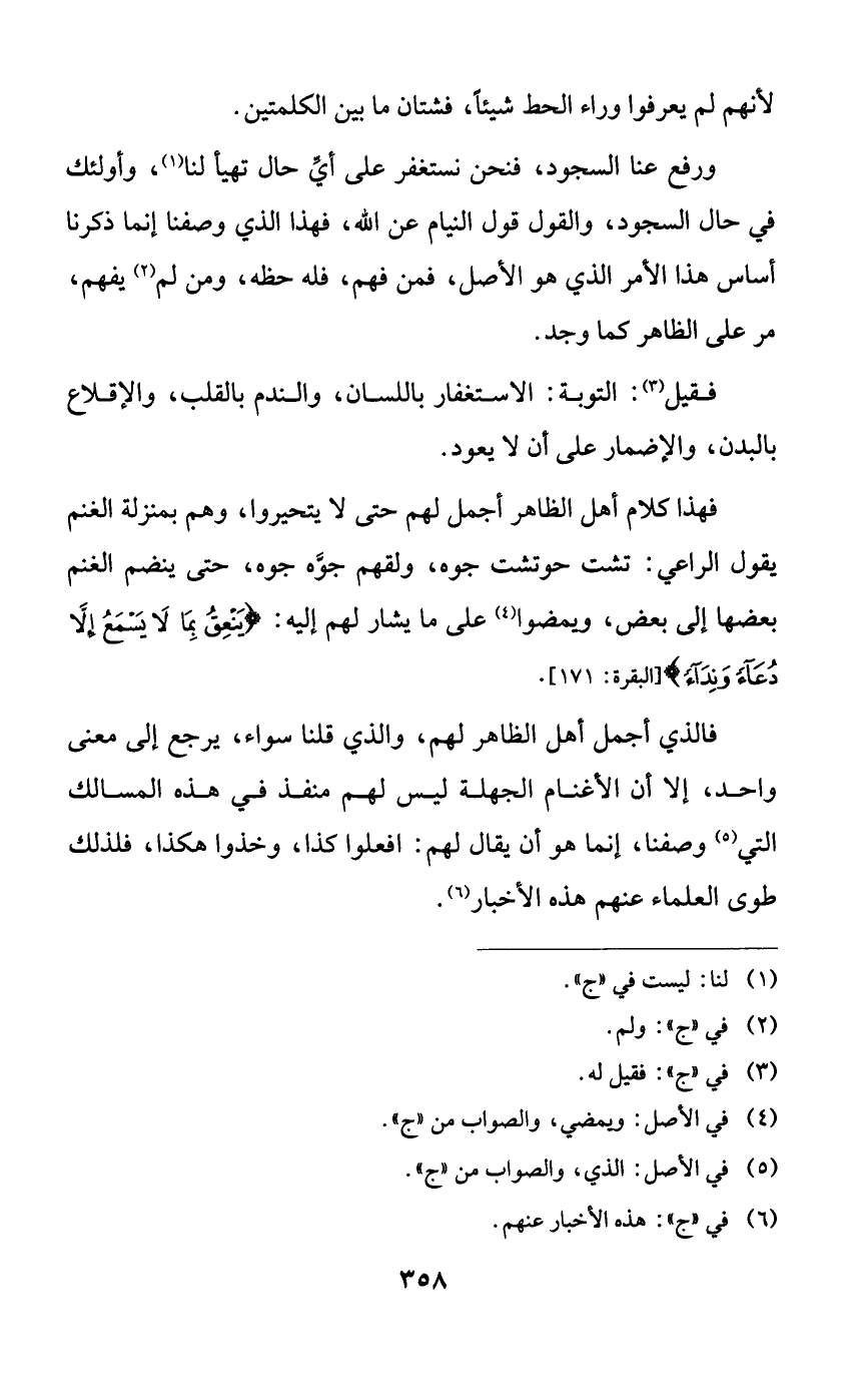 فهذا كلام أهل الظاهر أجمل لهم حتى لا يتحيروا، وهم بمنزلة الغنم يقول الراعي: تشت حوتشت جوه، ولقهم جوه جوه، حتى ينضم الغنم بعضها إلى بعض، ويمضوا على ما يشار لهم إليه: {ينعق بما لا يسمع إلا دعاء ونداءً}.