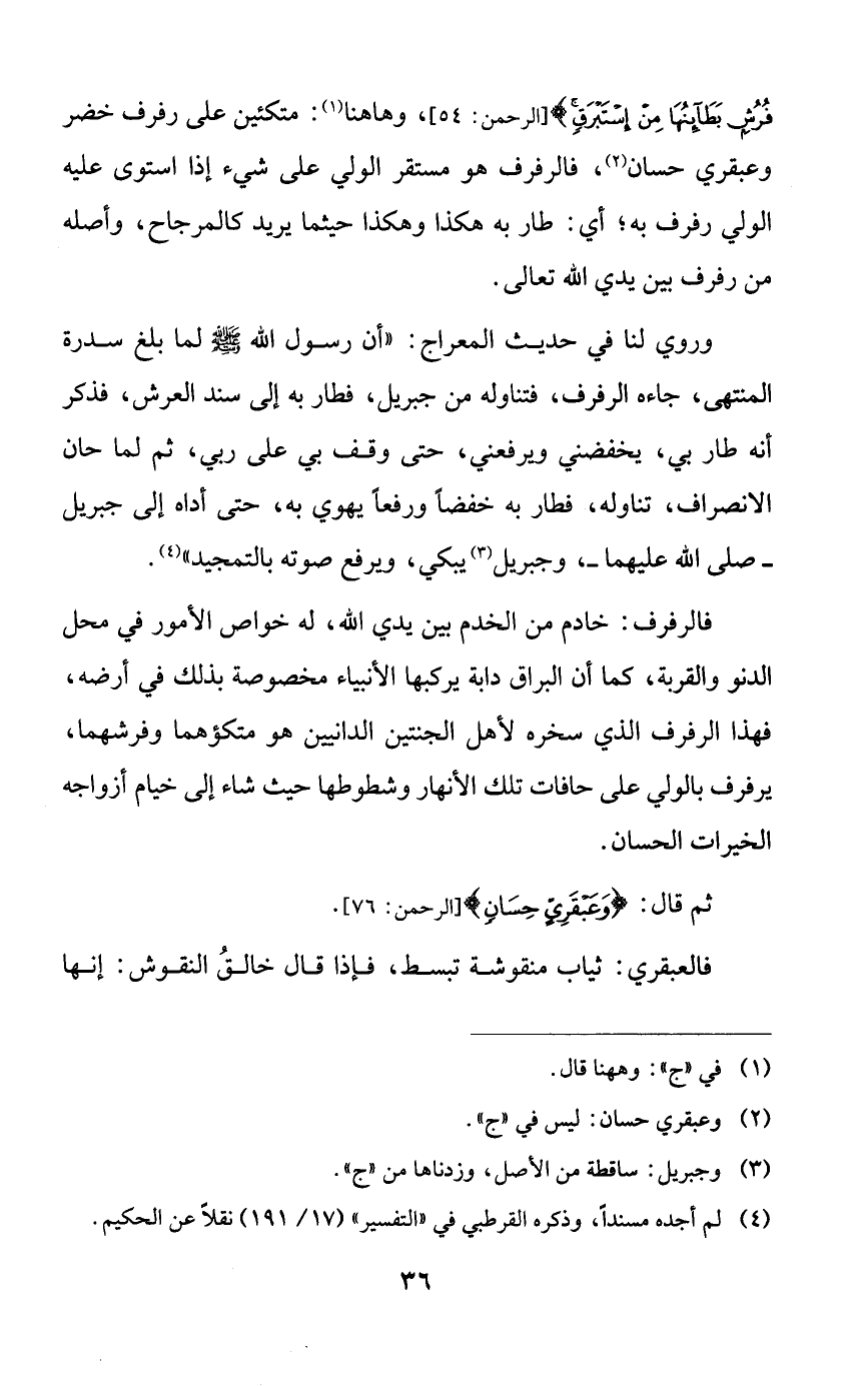 فالرفرف: خادم من الخدم بين يدي الله، له خواص الأمور في محل الدنو والقربة، كما أن البراق دابة يركبها الأنبياء مخصوصة بذلك في أرضه، فهذا الرفرف الذي سخره لأهل الجنتين الدانيين هو متكؤهما وفرشهما، يرفرف بالولي على حافات تلك الأنهار وشطوطها حيث شاء إلى خيام أزواجه الخيرات الحسان.