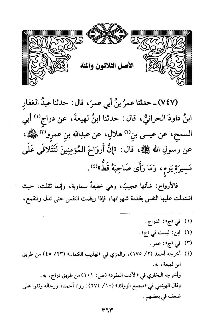 747 - حدثنا عمر بن أبي عمر، قال: حدثنا عبد الغفار ابن داود الحراني، قال: حدثنا ابن لهيعة، عن دراجٍ أبي السمح، عن عيسى بن هلالٍ، عن عبد الله بن عمرٍو رضي الله عنهما، عن رسول الله صلى الله عليه وسلم، قال: ((إن أرواح المؤمنين لتتلاقى على مسيرة يومٍ، وما رأى صاحبه قط)).