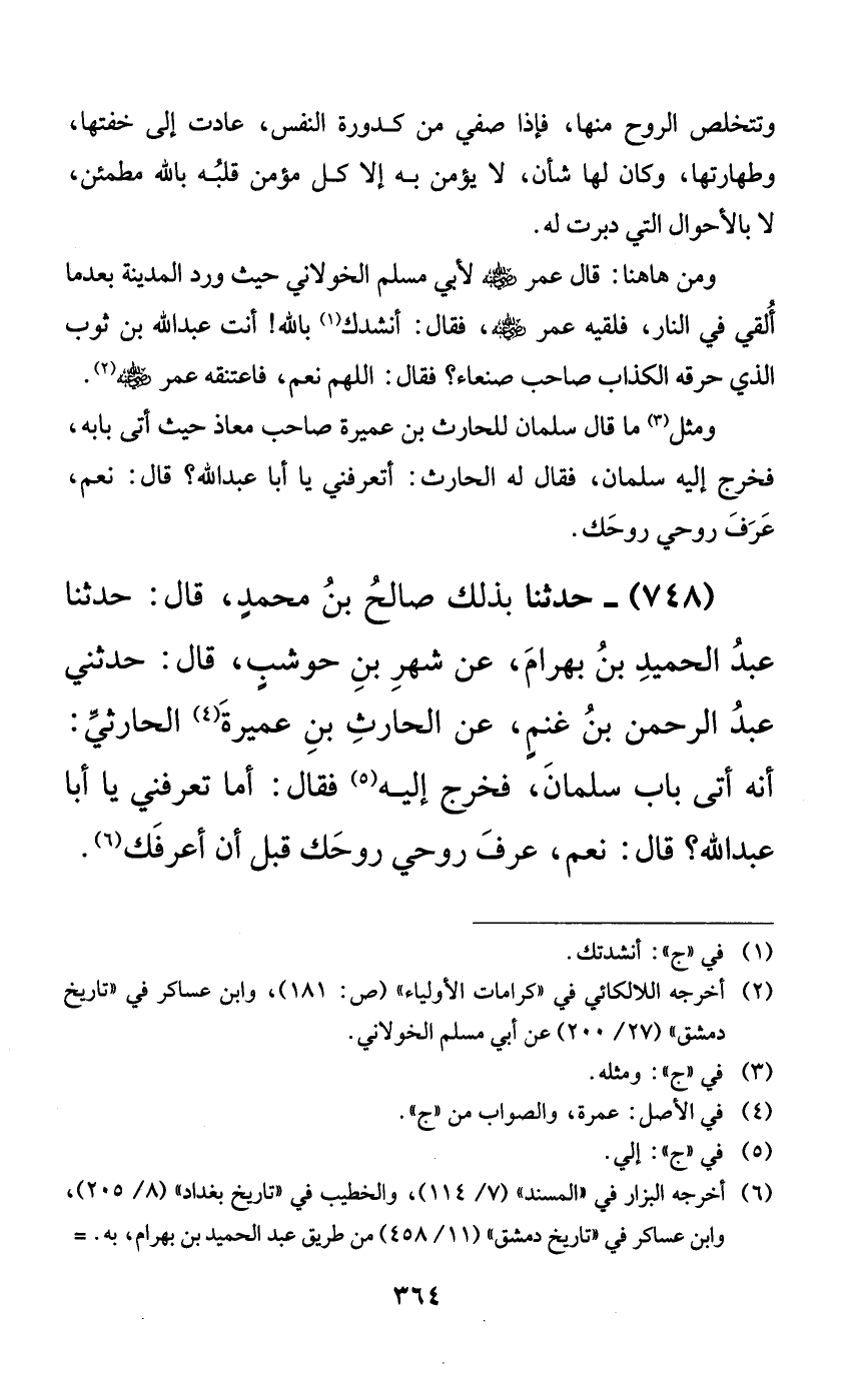 748 - حدثنا بذلك صالح بن محمدٍ، قال: حدثنا عبد الحميد بن بهرام، عن شهر بن حوشبٍ، قال: حدثني عبد الرحمن بن غنمٍ، عن الحارث بن عميرة الحارثي: أنه أتى باب سلمان، فخرج إليه فقال: أما تعرفني يا أبا عبد الله؟ قال: نعم، عرف روحي روحك قبل أن أعرفك.