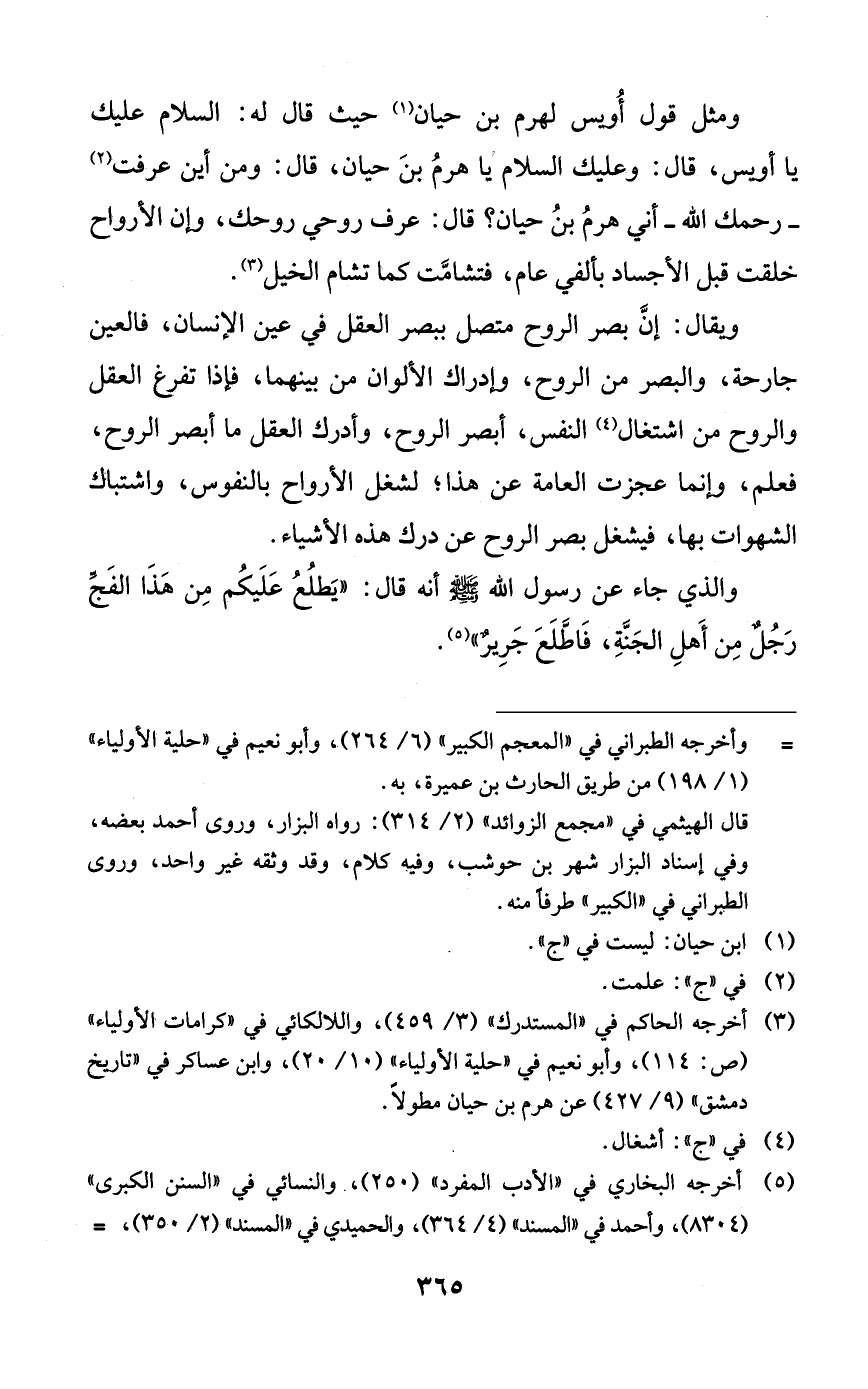 ومثل قول أويس لهرم بن حيان حيث قال له: السلام عليك يا أويس، قال: وعليك السلام يا هرم بن حيان، قال: ومن أين عرفت -رحمك الله- أني هرم بن حيان؟ قال: عرف روحي روحك، وإن الأرواح خلقت قبل الأجساد بألفي عام، فتشامت كما تشام الخيل.