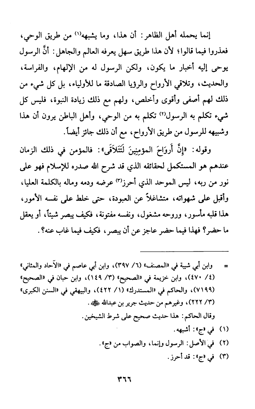 إنما يحمله أهل الظاهر: أن هذا، وما يشبهه من طريق الوحي، فعذروا فيما قالوا؛ لأن هذا طريق سهل يعرفه العالم والجاهل: أن الرسول يوحى إليه أخبار ما يكون، ولكن الرسول له من الإلهام، والفراسة، والحديث، وتلاقي الأرواح والرؤيا الصادقة ما للأولياء، بل كل شيء من ذلك لهم أصفى وأقوى وأخلص، ولهم مع ذلك زيادة النبوة، فليس كل شيء تكلم به الرسول تكلم به من الوحي، وأهل الباطن يرون أن هذا وشبيهه للرسول من طريق الأرواح، مع أن ذلك جائز أيضاً.