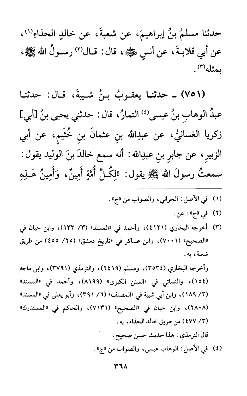 751 - حدثنا يعقوب بن شيبة، قال: حدثنا عبد الوهاب بن عيسى التمار، قال: حدثني يحيى بن [أبي] زكريا الغساني، عن عبد الله بن عثمان بن خثيمٍ، عن أبي الزبير، عن جابر بن عبد الله: أنه سمع خالد بن الوليد يقول: سمعت رسول الله صلى الله عليه وسلم يقول: ((لكل أمةٍ أمينٌ، وأمين هذه