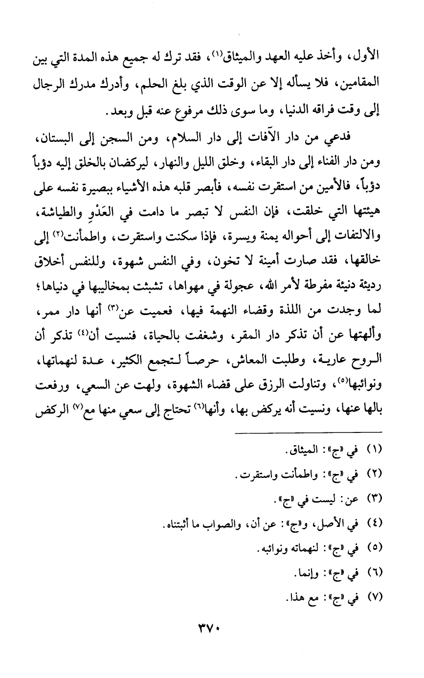 فدعي من دار الآفات إلى دار السلام، ومن السجن إلى البستان، ومن دار الفناء إلى دار البقاء، وخلق الليل والنهار، ليركضان بالخلق إليه دؤباً دؤباً، فالأمين من استقرت نفسه، فأبصر قلبه هذه الأشياء ببصيرة نفسه على هيئتها التي خلقت، فإن النفس لا تبصر ما دامت في العدو والطياشة، والالتفات إلى أحواله يمنة ويسرة، فإذا سكنت واستقرت، واطمأنت إلى خالقها، فقد صارت أمينة لا تخون، وفي النفس شهوة، وللنفس أخلاق رديئة دنيئة مفرطة لأمر الله، عجولة في مهواها، تشبثت بمخاليبها في دنياها؛ لما وجدت من اللذة وقضاء النهمة فيها، فعميت عن أنها دار ممر، وألهتها عن أن تذكر دار المقر، وشغفت بالحياة، فنسيت أن تذكر أن الروح عارية، وطلبت المعاش، حرصاً لتجمع الكثير، عدة لنهماتها، ونوائبها، وتناولت الرزق على قضاء الشهوة، ولهت عن السعي، ورفعت بالها عنها، ونسيت أنه يركض بها، وأنها تحتاج إلى سعي منها مع الركض
