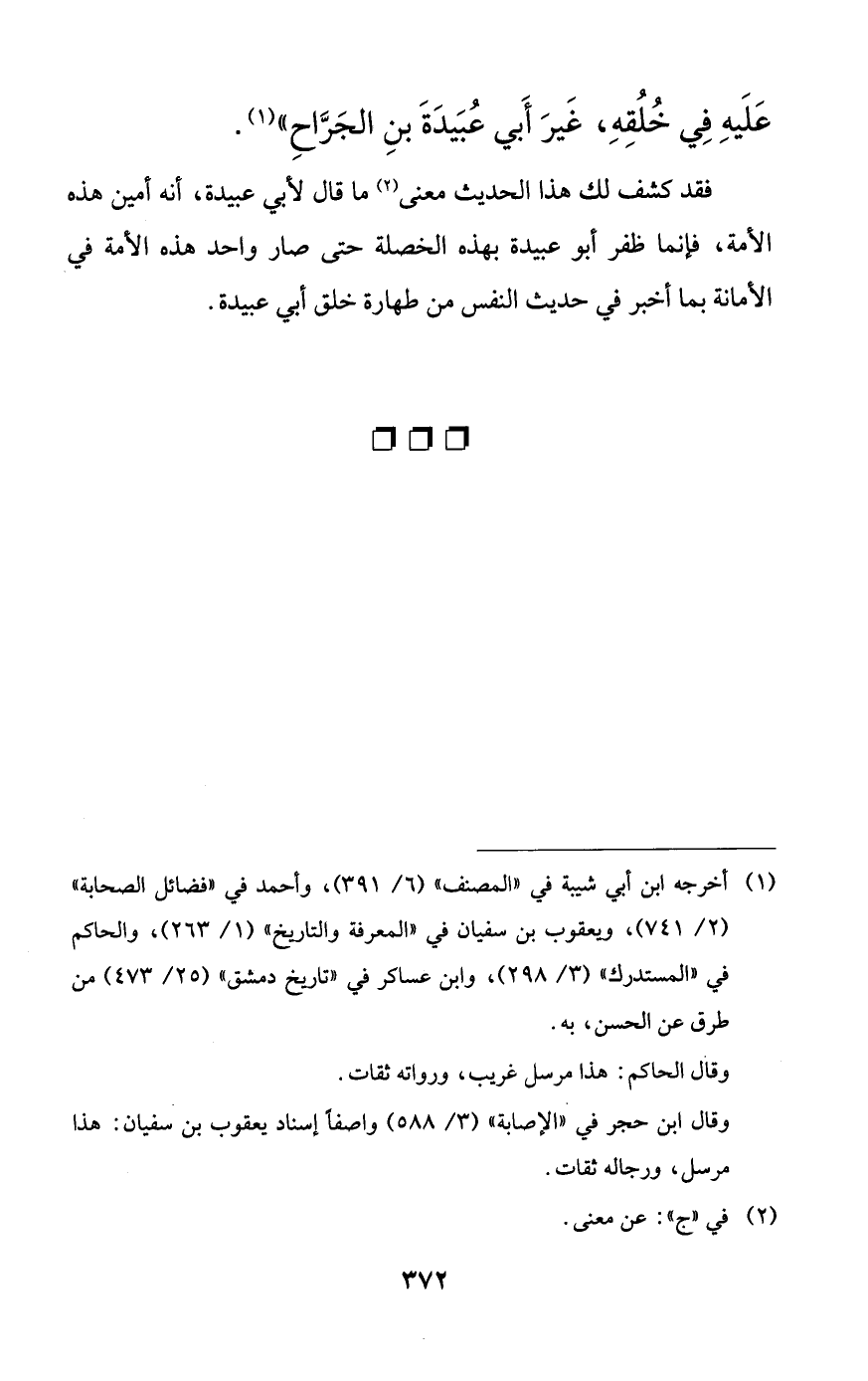 فقد كشف لك هذا الحديث معنى ما قال لأبي عبيدة، أنه أمين هذه الأمة، فإنما ظفر أبو عبيدة بهذه الخصلة حتى صار واحد هذه الأمة في الأمانة بما أخبر في حديث النفس من طهارة خلق أبي عبيدة.