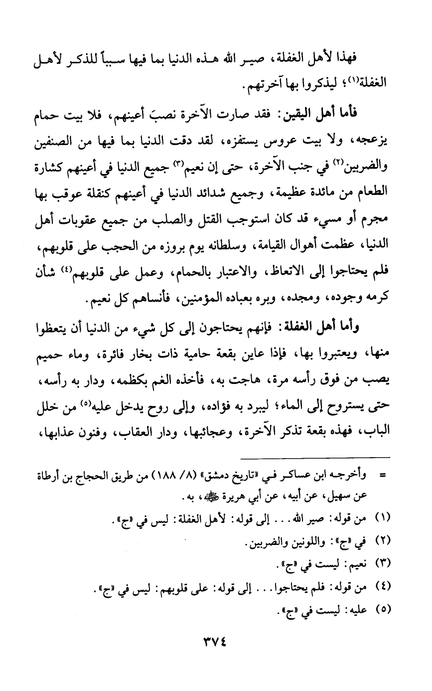 فأما أهل اليقين: فقد صارت الآخرة نصب أعينهم، فلا بيت حمام يزعجه، ولا بيت عروس يستفزه، لقد دقت الدنيا بما فيها من الصنفين والضربين في جنب الآخرة، حتى إن نعيم جميع الدنيا في أعينهم كشارة الطعام من مائدة عظيمة، وجميع شدائد الدنيا في أعينهم كنقلة عوقب بها مجرم أو مسيء قد كان استوجب القتل والصلب من جميع عقوبات أهل الدنيا، عظمت أهوال القيامة، وسلطانه يوم بروزه من الحجب على قلوبهم، فلم يحتاجوا إلى الاتعاظ، والاعتبار بالحمام، وعمل على قلوبهم شأن كرمه وجوده، ومجده وبره بعباده المؤمنين، فأنساهم كل نعيم.