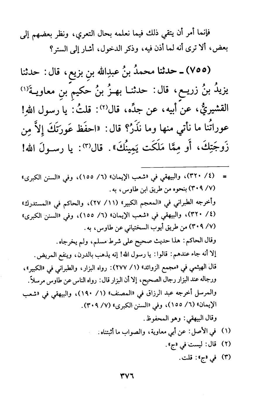 755 - حدثنا محمد بن عبد الله بن بزيعٍ، قال: حدثنا يزيد بن زريعٍ، قال: حدثنا بهز بن حكيم بن معاوية القشيري، عن أبيه، عن جده، قال: قلت: يا رسول الله! عوراتنا ما نأتي منها وما نذر؟ قال: ((احفظ عورتك إلا من زوجتك، أو مما ملكت يمينك)). قال: يا رسول الله!