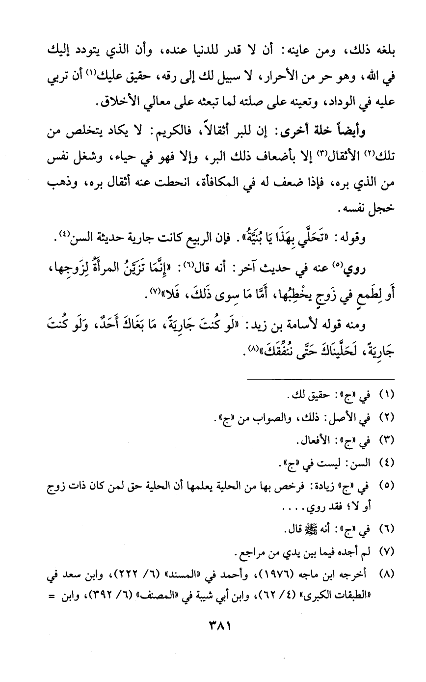 ومنه قوله لأسامة بن زيد: ((لو كنت جاريةً، ما بغاك أحدٌ، ولو كنت جاريةً، لحليناك حتى ننفقك)).